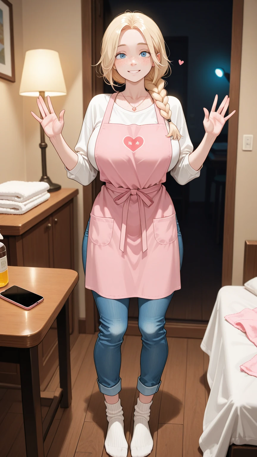 [She gives a nervous smile, standing by the soft massage table in her little room, her hands twisting the hem of her light pink apron. Her big, kind blue eyes look at you as she tucks a strand of blonde hair from her loose braid behind her ear.]