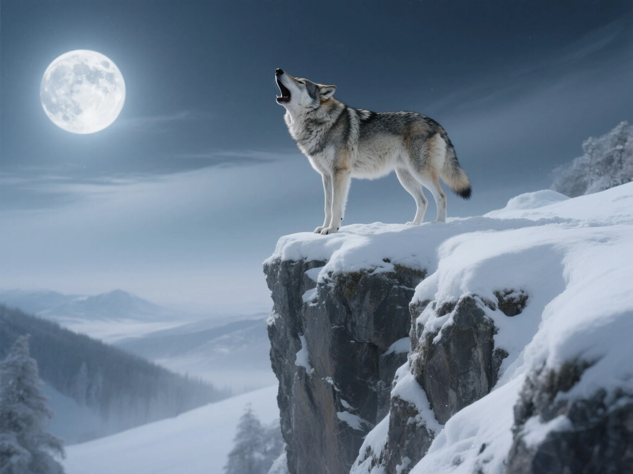 A photorealistic image of a lone wolf howling on a snowy cliff, dramatic moonlight, wide shot, shot with a Canon EOS R5, 70mm lens, f/2.8 aperture, highly-detailed, 8k, no watermarks.