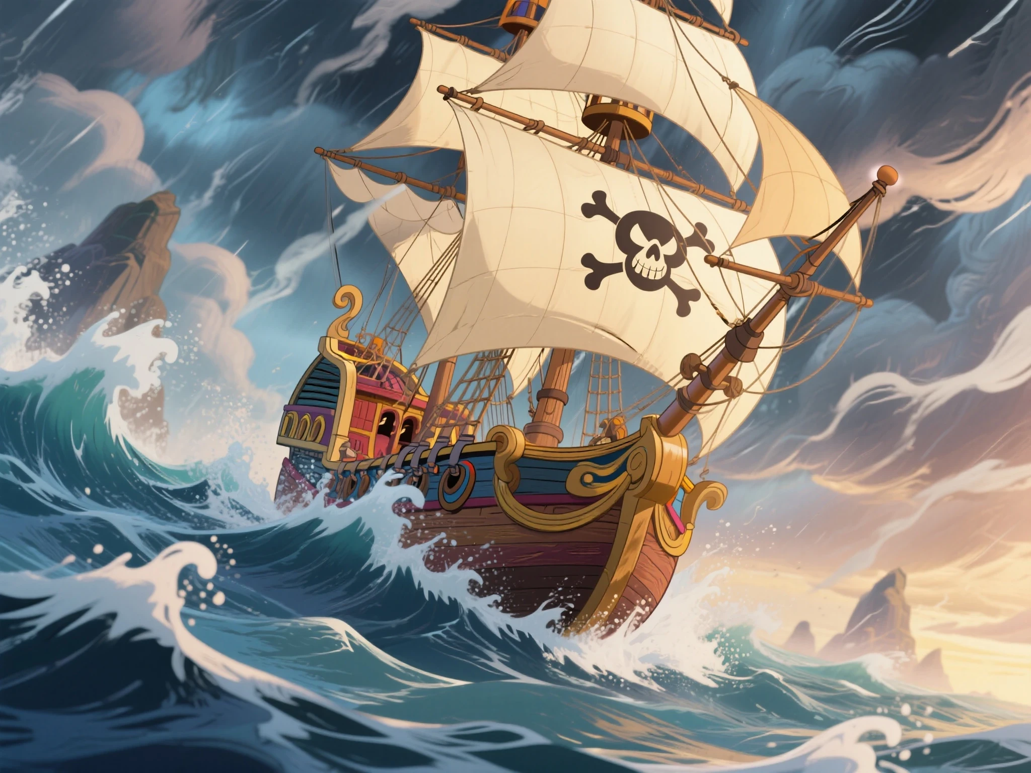 A cartoon illustration of a pirate ship sailing through a stormy sea, dynamic angles, in the style of Disney animation, bright colors, 4k.