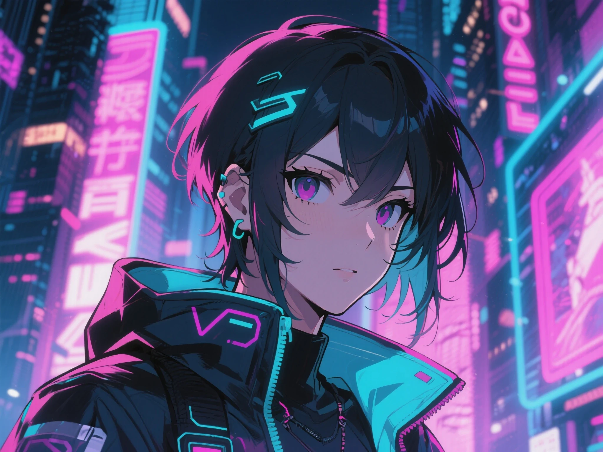 An anime-style portrait of a cyberpunk hacker, neon-lit city background, close-up, in the style of Shigenori Soejima, highly-detailed, 4k.
