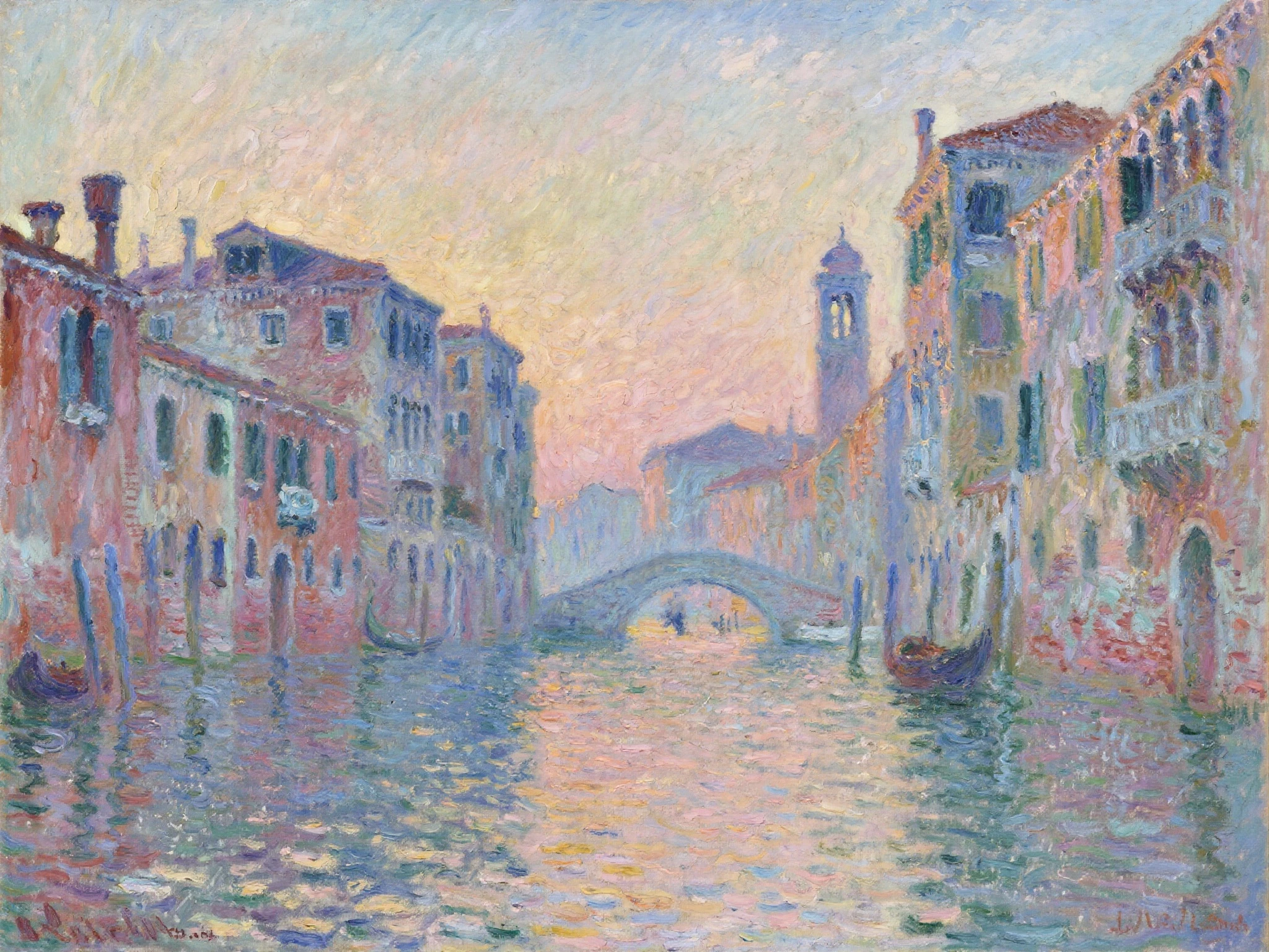 An impressionist painting of a Venetian canal at dusk, vibrant colors, by Claude Monet, soft brushstrokes, highly-detailed, trending on ArtStation.