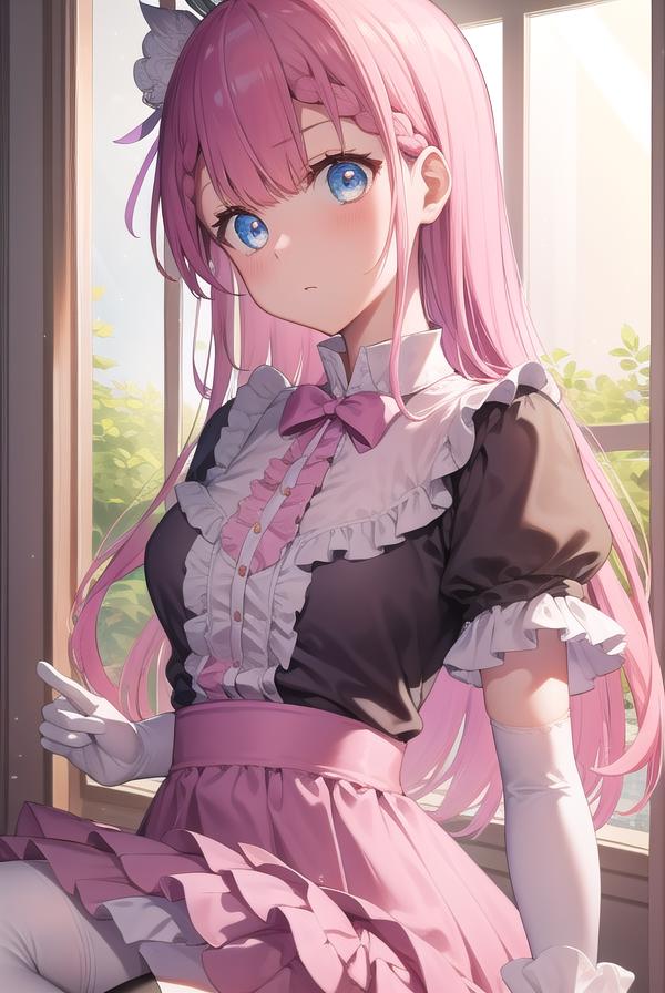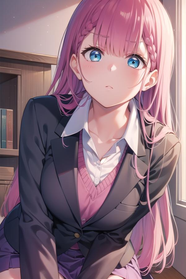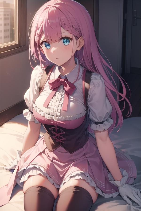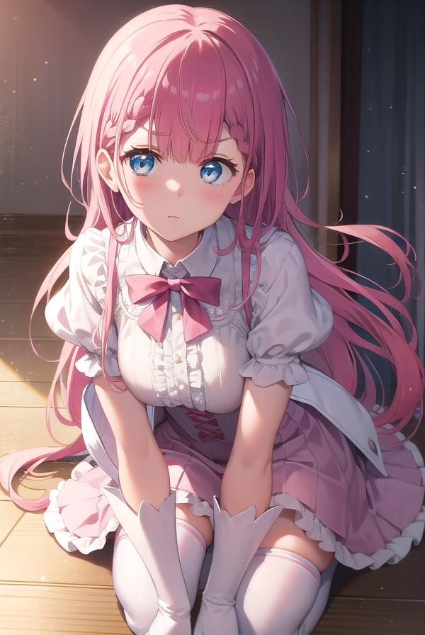 mafuyu kirisu, blue eyes, braid, long hair, twin braids, pink hair,