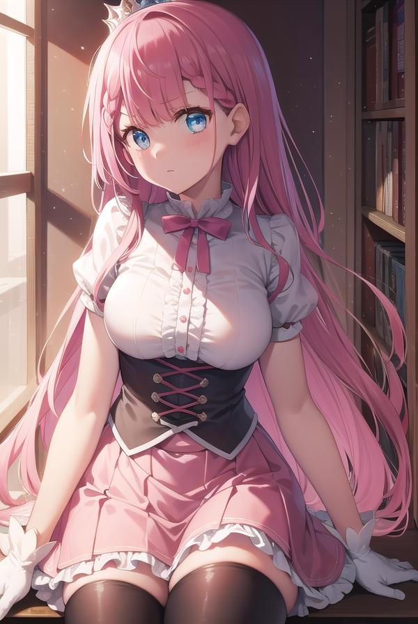 boots, center frills, dress, elbow gloves, frilled skirt, frills, gloves, magical girl, pink skirt, puffy short sleeves, puffy sleeves, purple thighhighs, short sleeves, skirt, thigh boots, thighhighs, tiara, white gloves