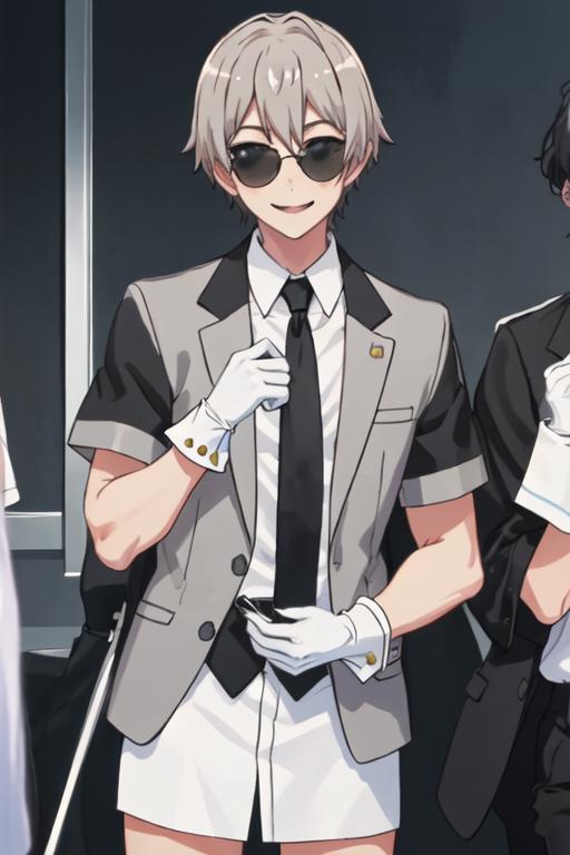 grey_hair, short_hair, male_focus, blue_eyes, blush, smile