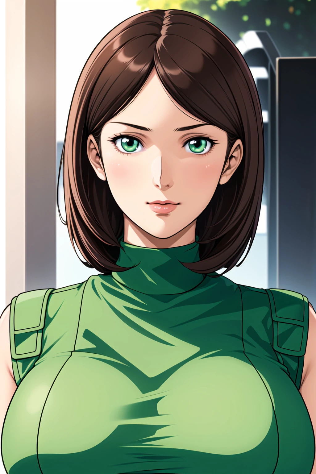 brown hair, bob hair, (center_parted_bangs:1.5), green eyes,lipstick,
