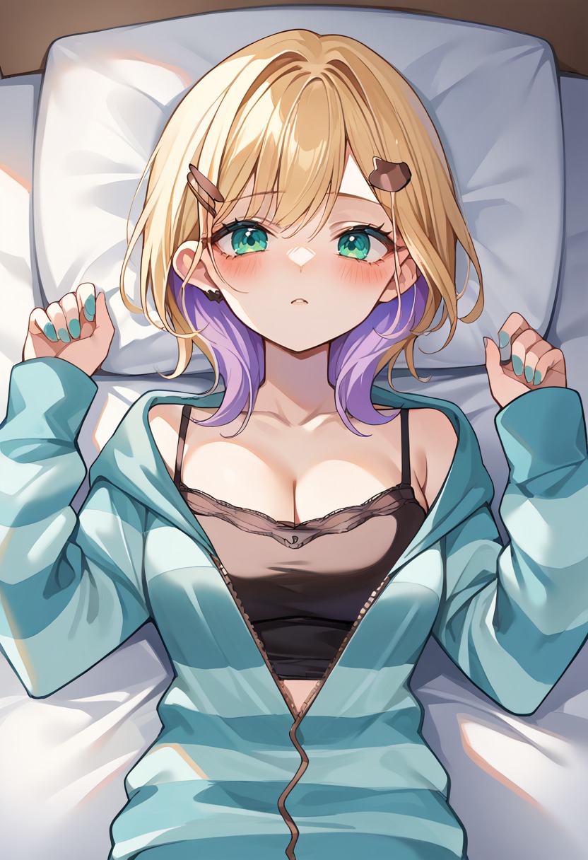 score_9, score_8_up, source_anime, 1girl, solo, NoahSleepwear, medium hair, hairclip, aqua cardigan, striped cardigan, partially unzipped, black camisole, cleavage, aqua shorts, on back, on bed, blush