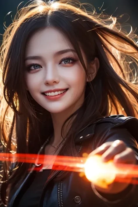 1 girl, flying hair, red eyes, Fire Witch , Blood on face, Light Particles , Lightning rays, wallpaper, colorful, high contrast , , smirking , , psychopathic smirking , Psychopath Smile , tilting your head