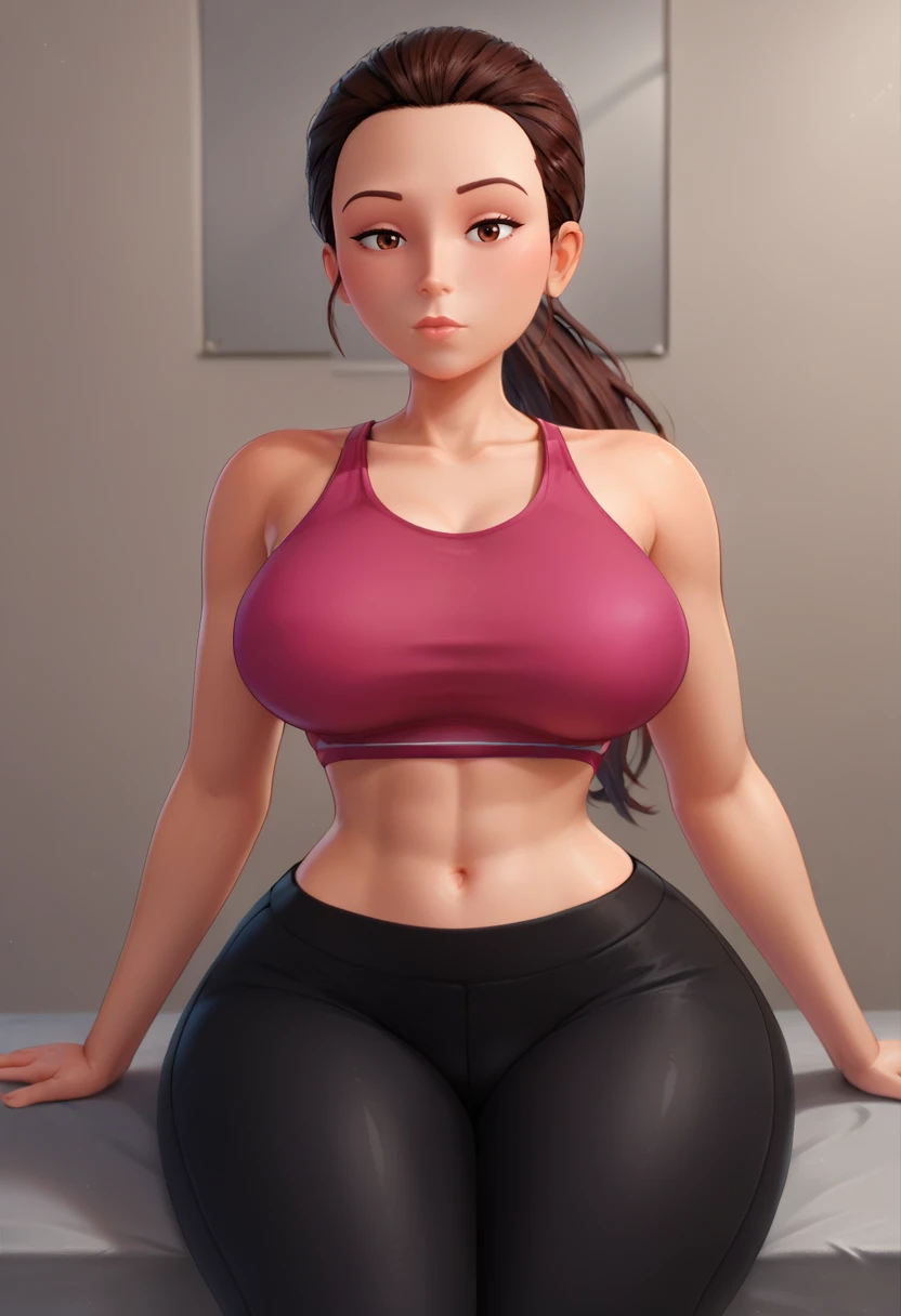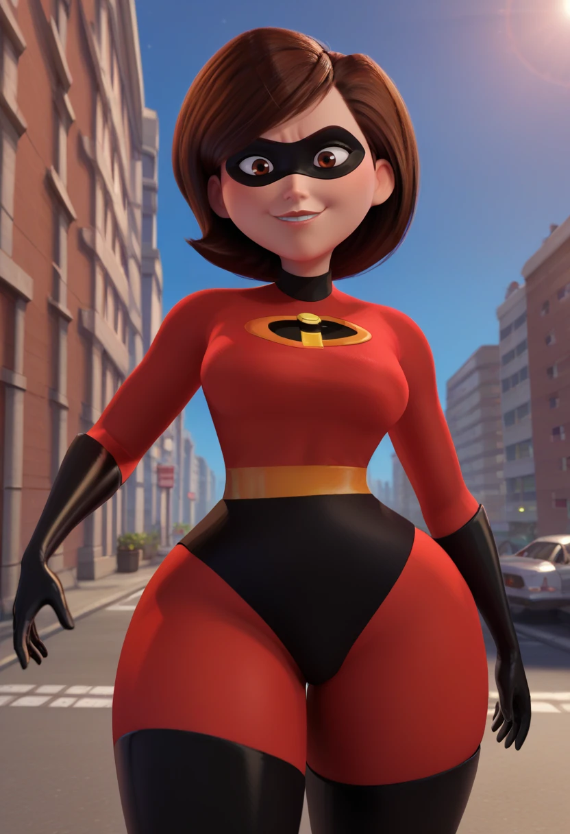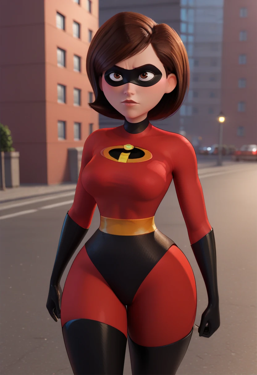 helenparrSDXL,1girl,short hair,brown hair,thighhighs,gloves,brown eyes,red bodysuit,superhero,domino mask,black gloves,cowboy shot,