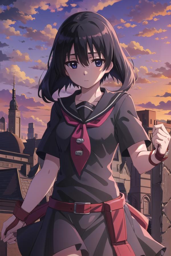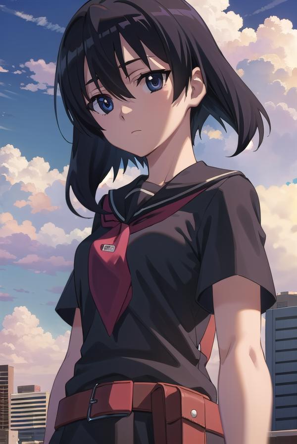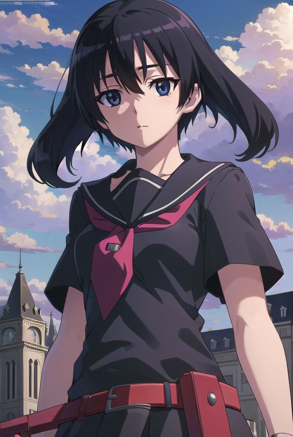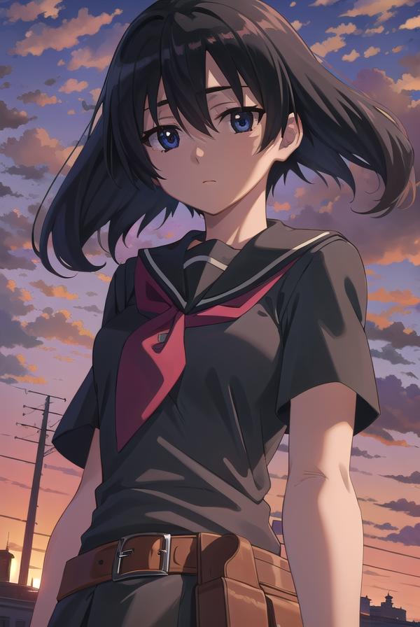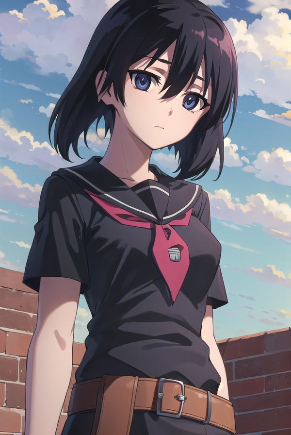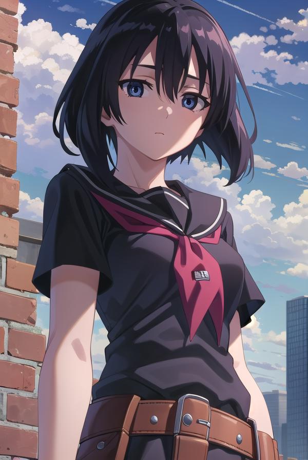 skirt, school uniform, serafuku, belt, black serafuku, short sleeves, belt, black skirt, neckerchief, red neckerchief,