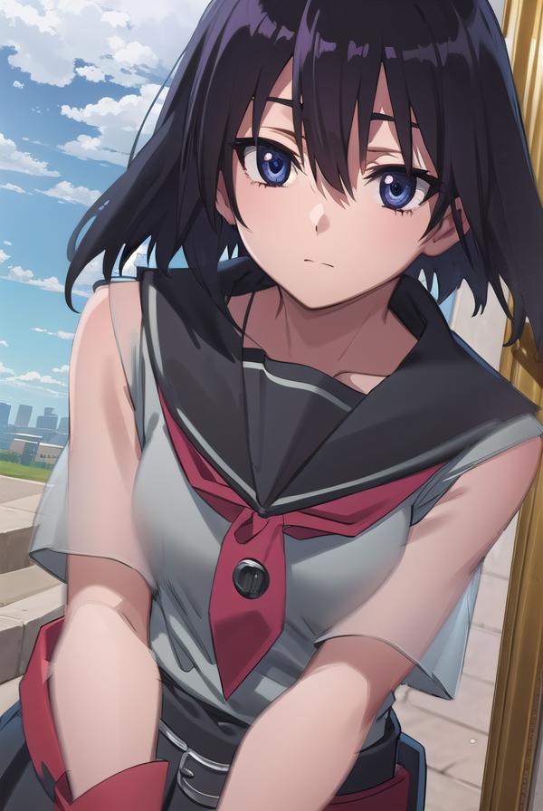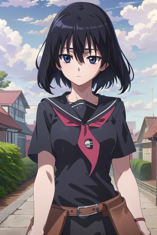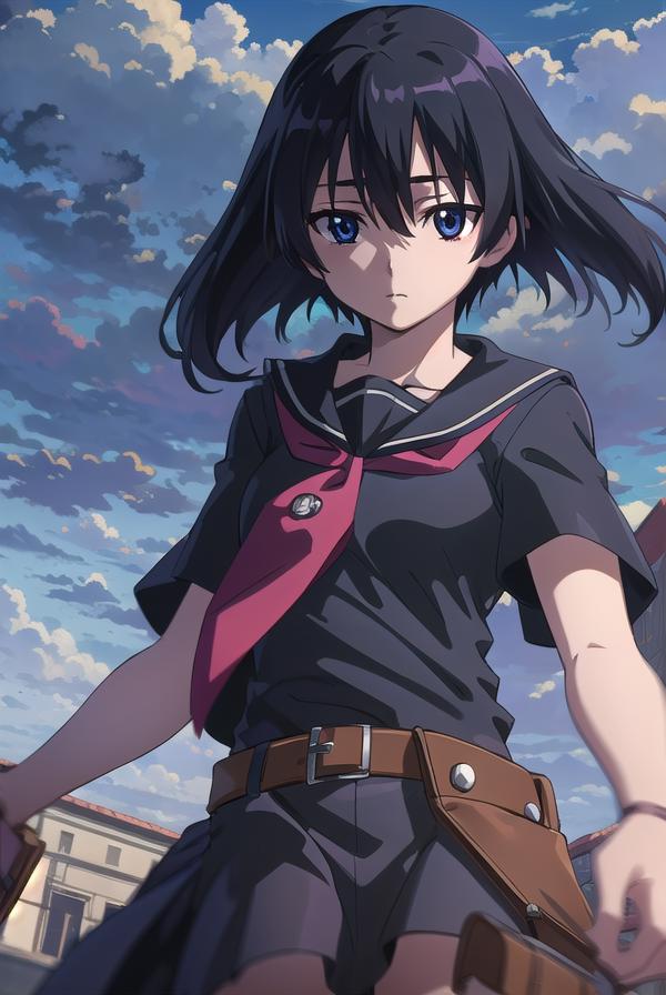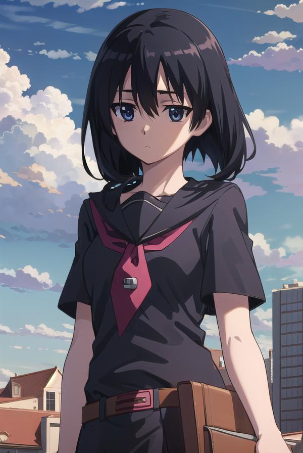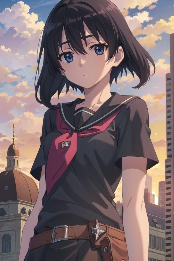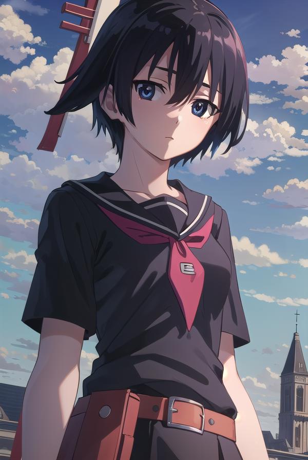 skirt, school uniform, serafuku, belt, black serafuku, short sleeves, belt, black skirt, neckerchief, red neckerchief,