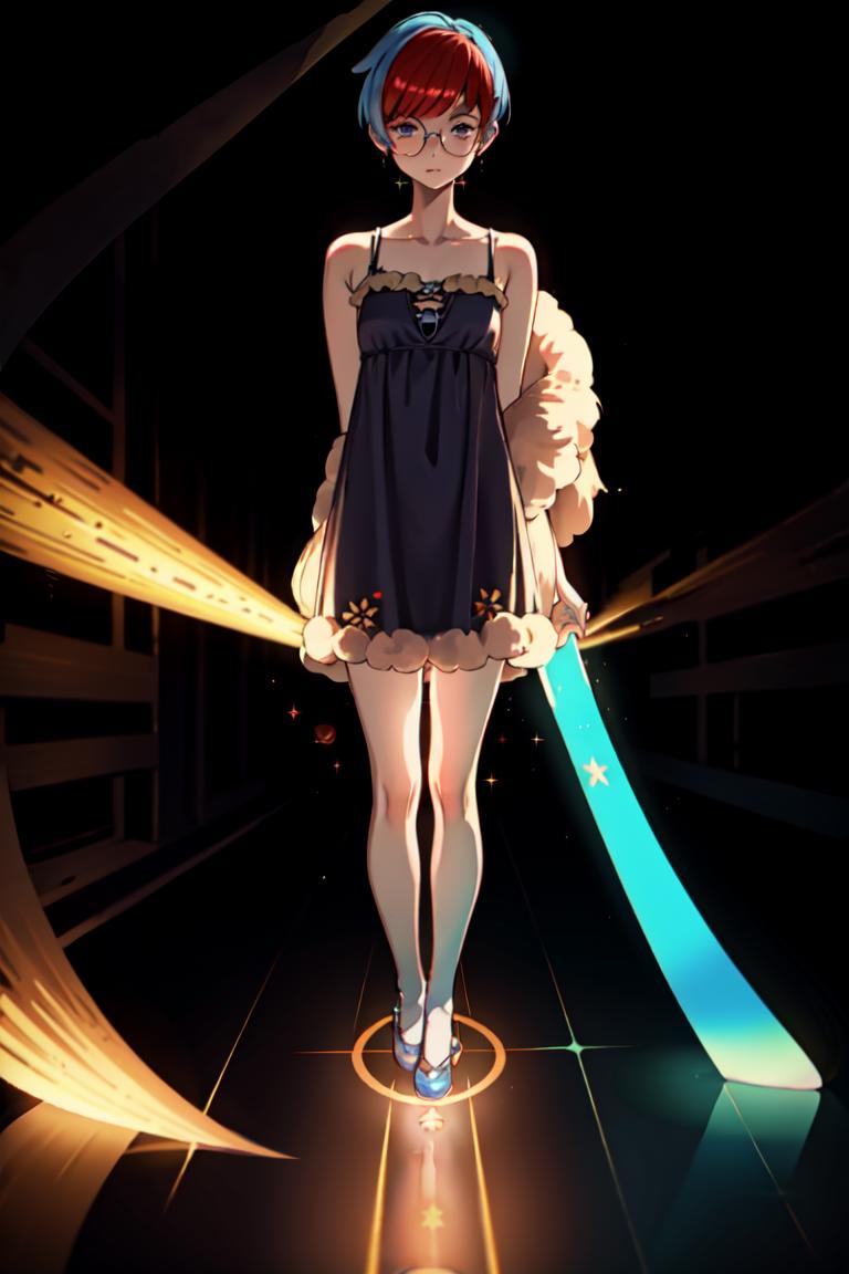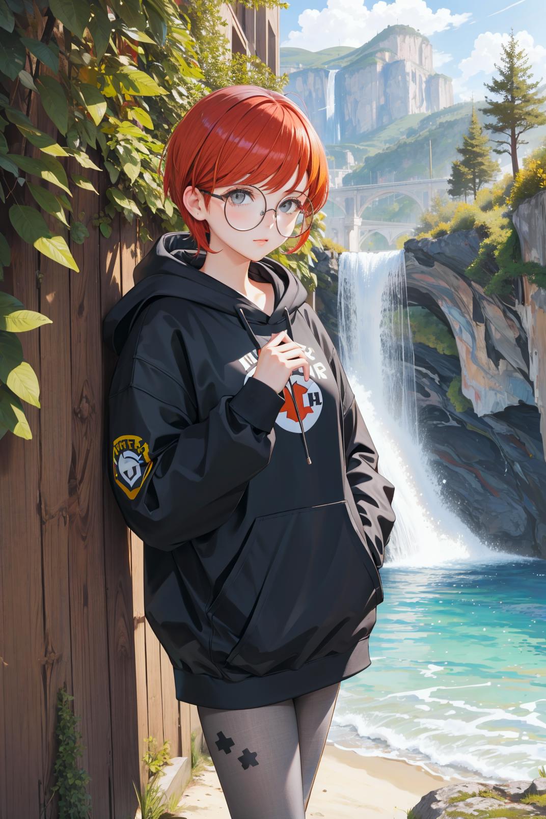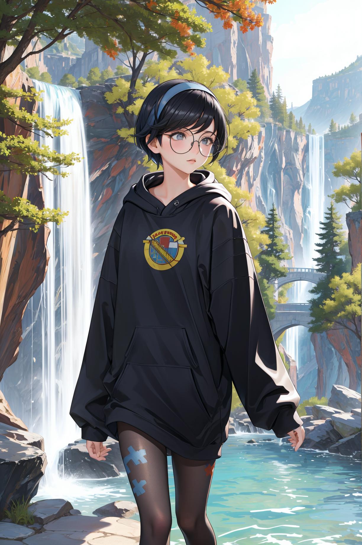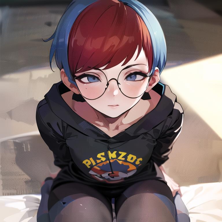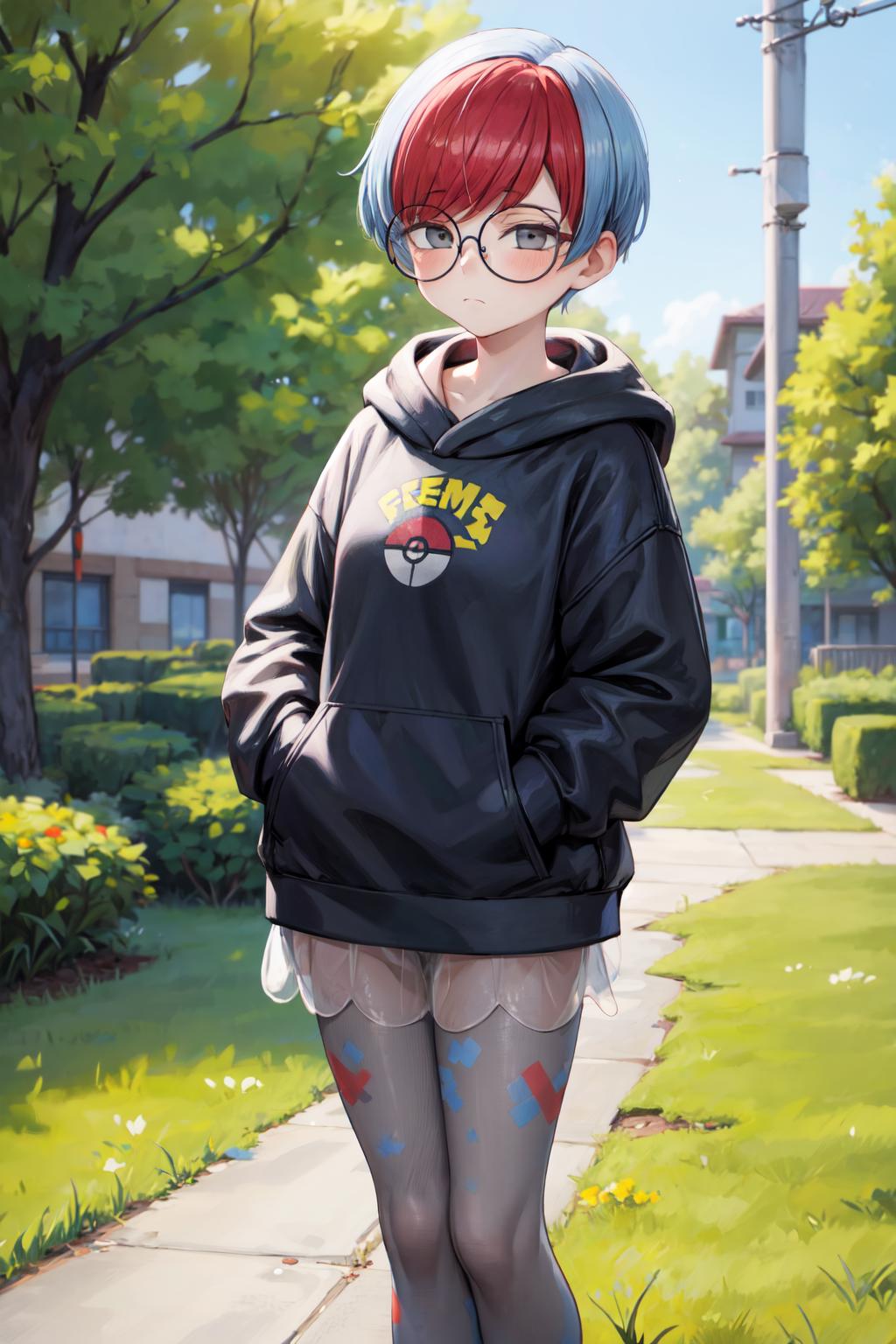 You can use "black hoodie, grey pantyhose" for the standard outfit (add the prompt "pokemon" to try to generate the hoodie's stamp).