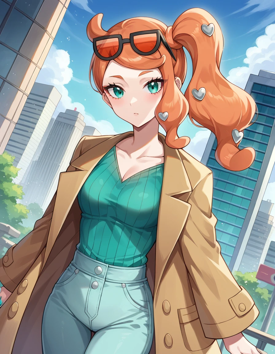 aqua footwear, aqua nails, aqua shirt, brown coat, brown jacket, coat, collarbone, eyewear on head, jacket, long sleeves, orange-tinted eyewear, pants, ribbed shirt, shirt, sunglasses, tinted eyewear,