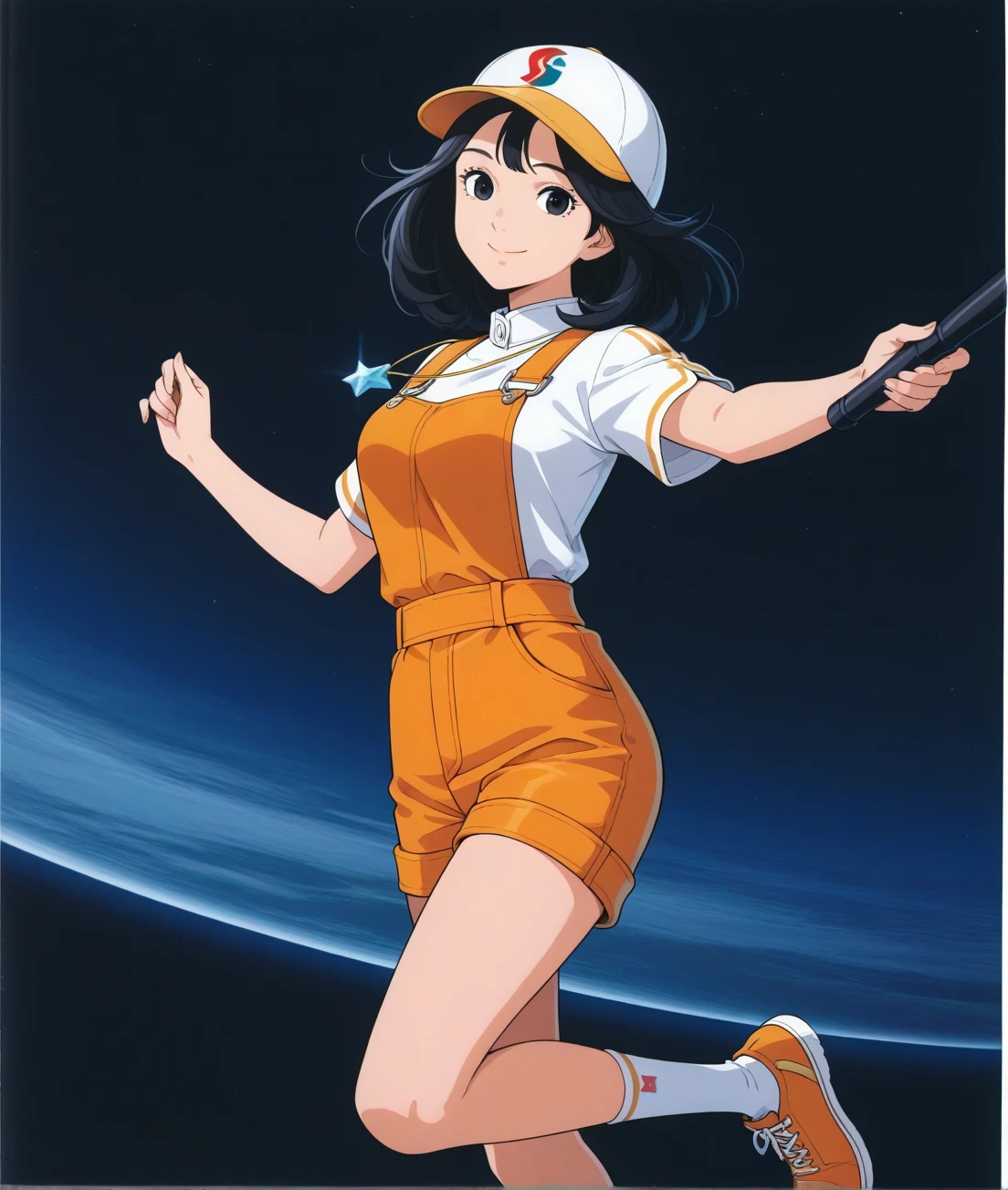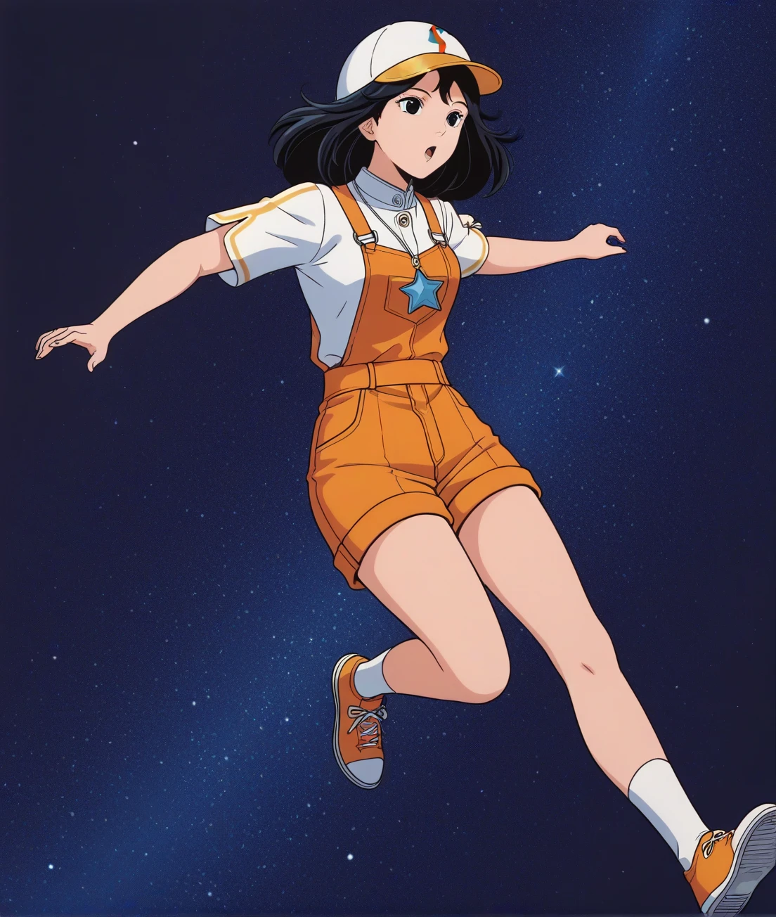 cometsan2, black hair, medium hair, brown eyes, white cap, breasts, orange short overalls,short sleeves shirt, pendant, socks, orange shoes,