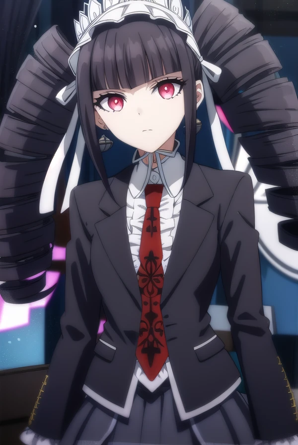 celestia ludenberg, long hair, bangs, black hair, (red eyes:1.3), long sleeves, twintails, drill hair, twin drills,