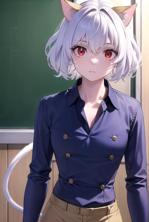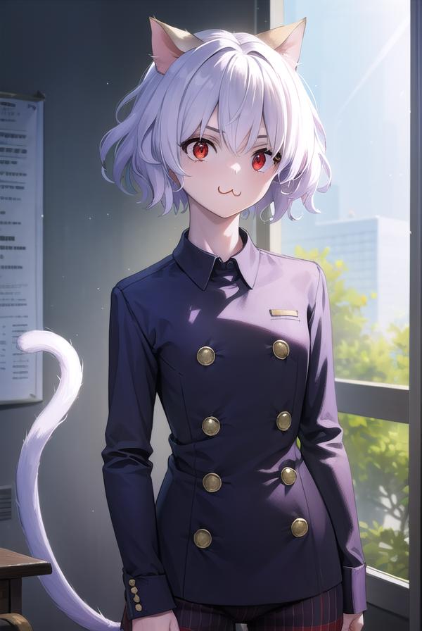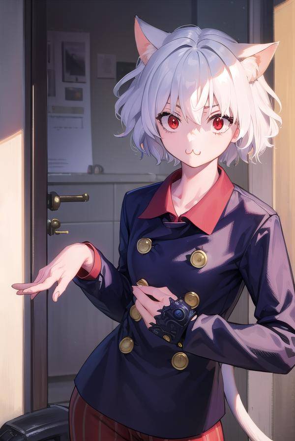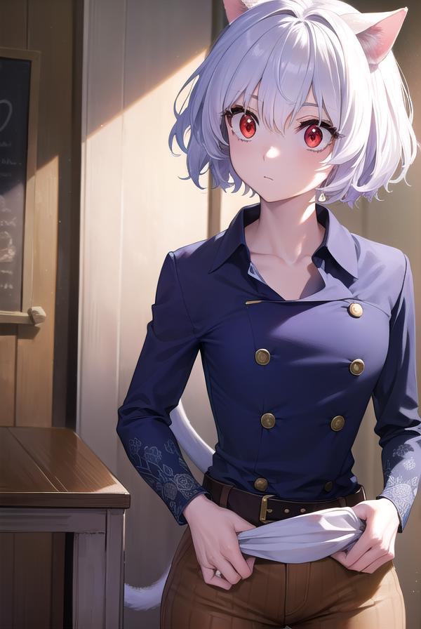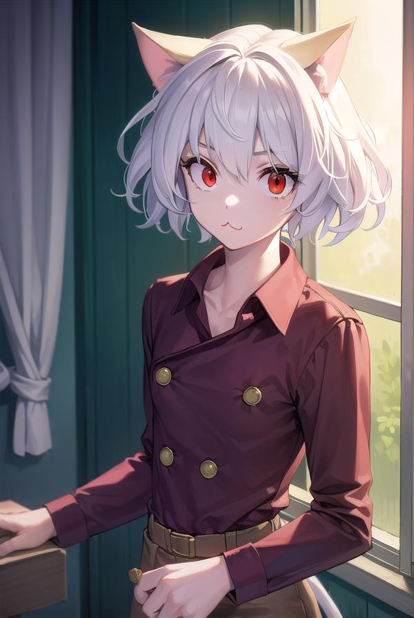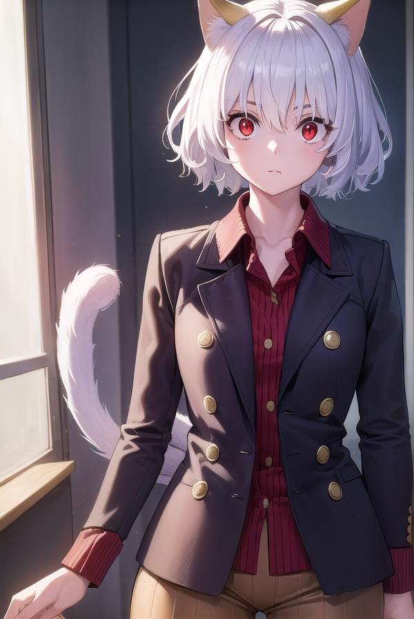 neferpitou, short hair, (red eyes:1.5), animal ears, hair between eyes, tail, white hair, cat ears, cat tail, cat girl, curly hair,