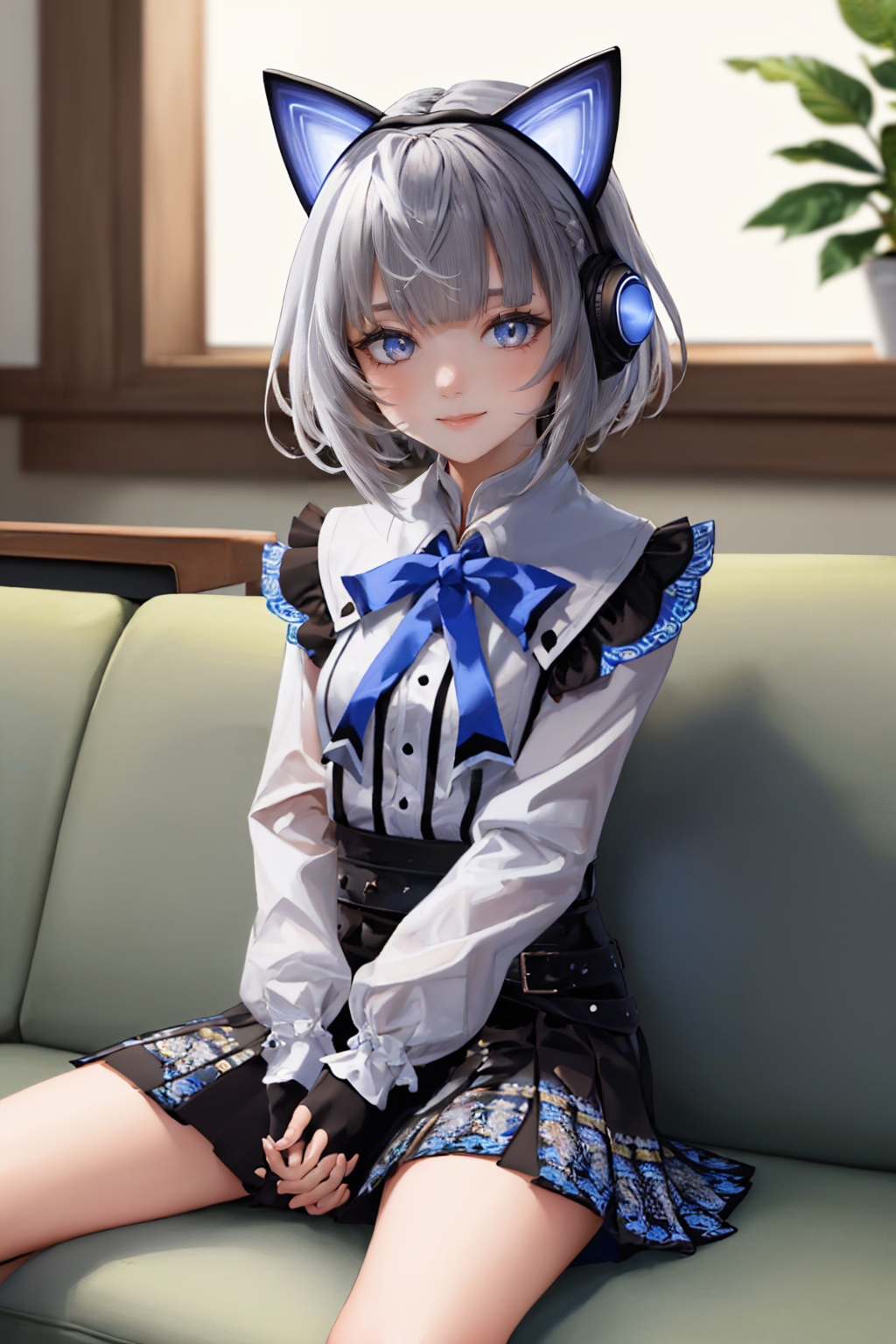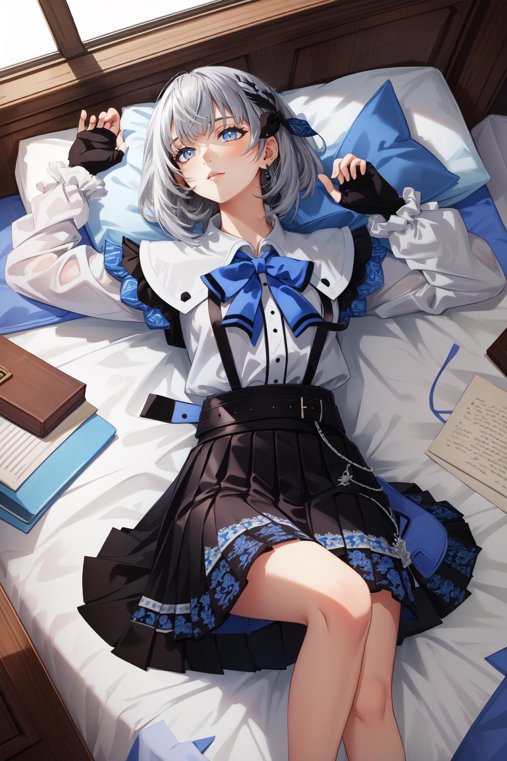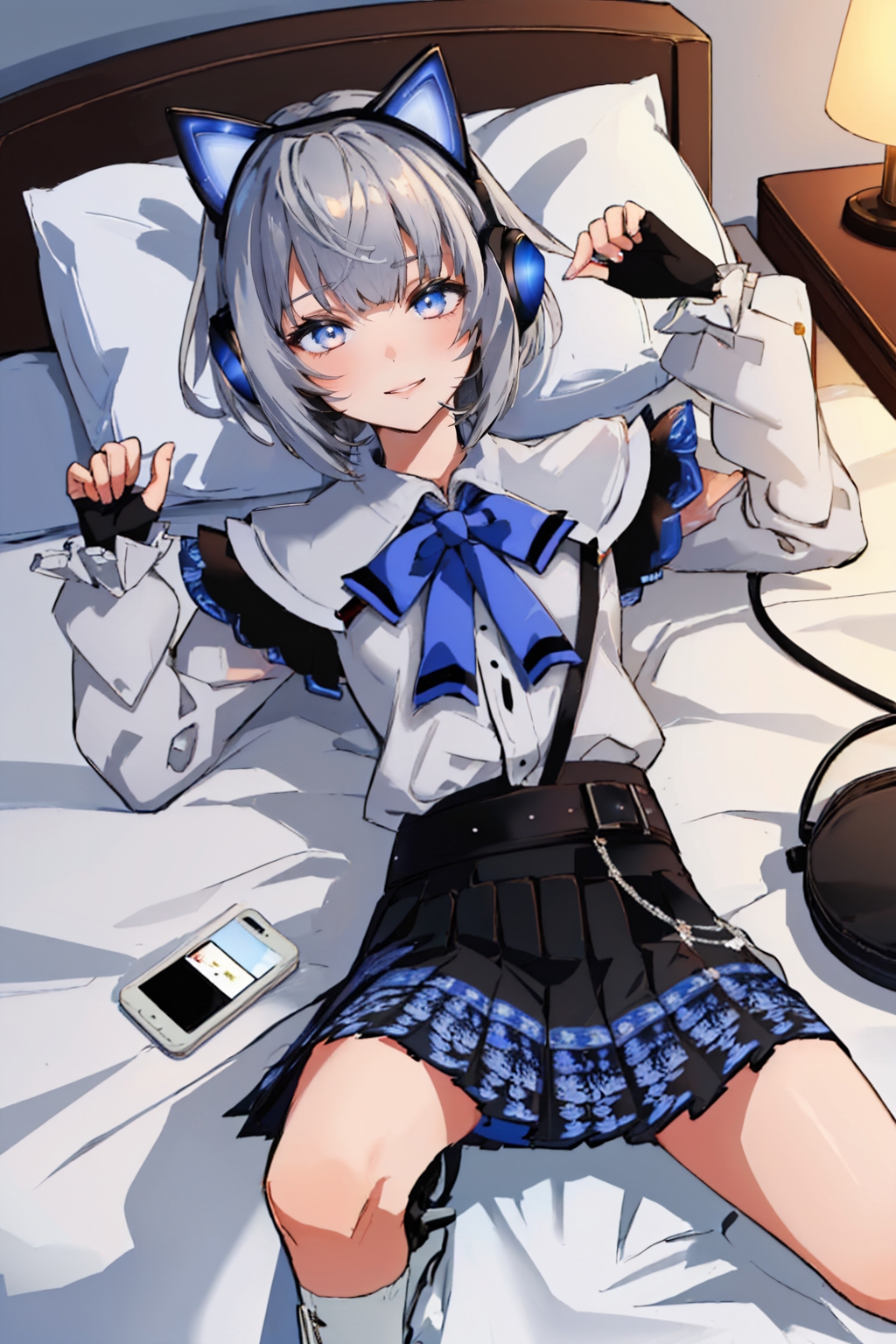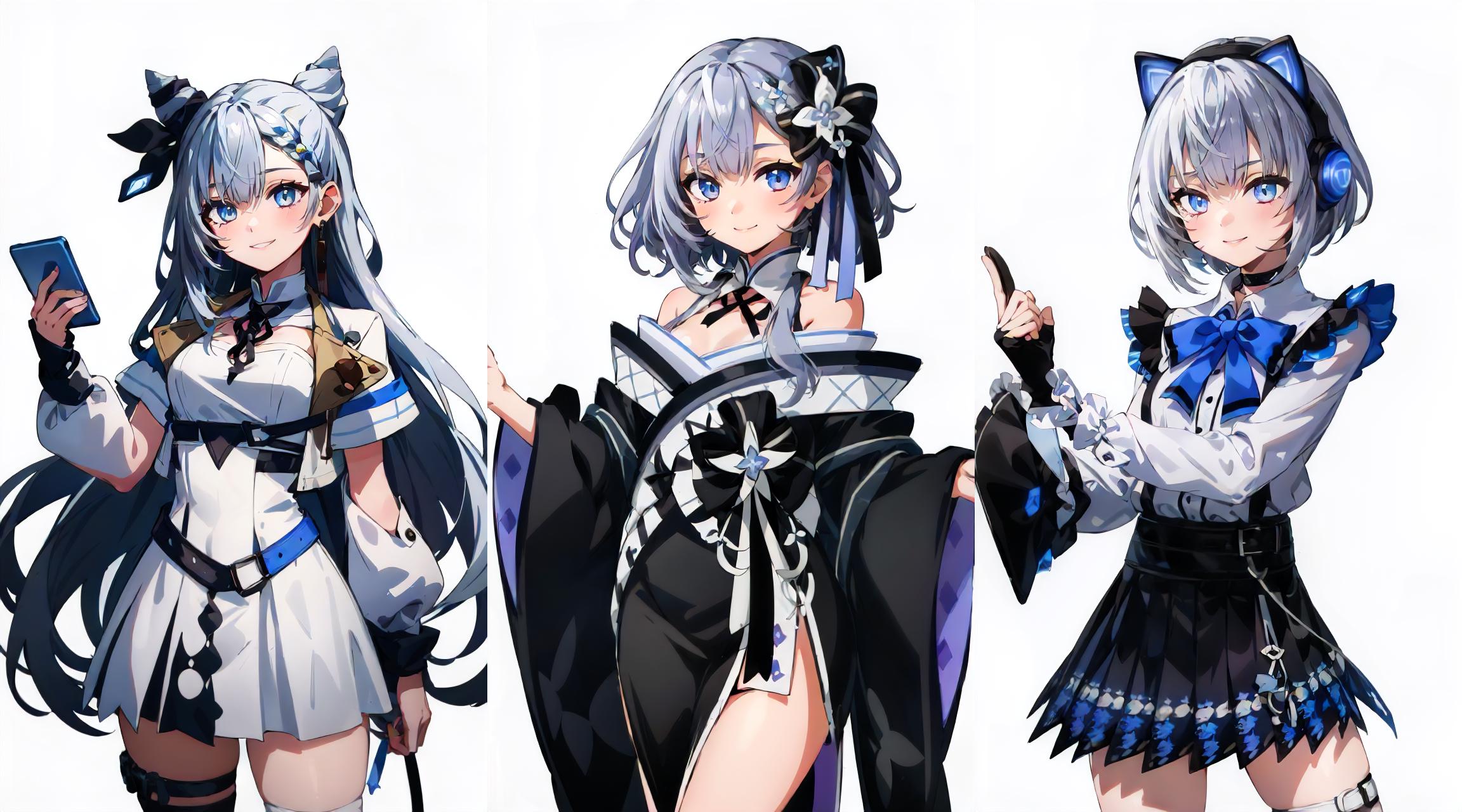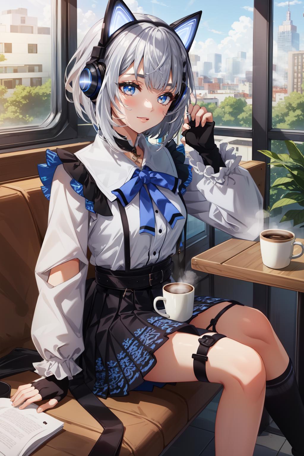 Third Costume: vestia3rd, headphones, white shirt, blue bow, long sleeves, fingerless gloves, black skirt