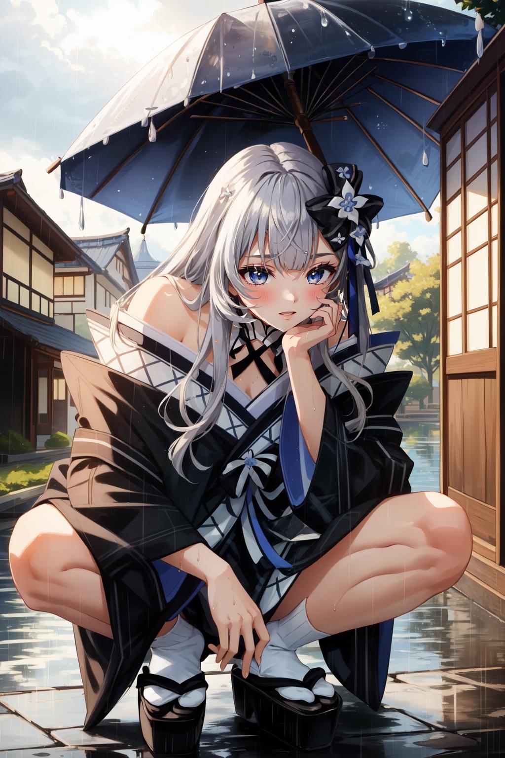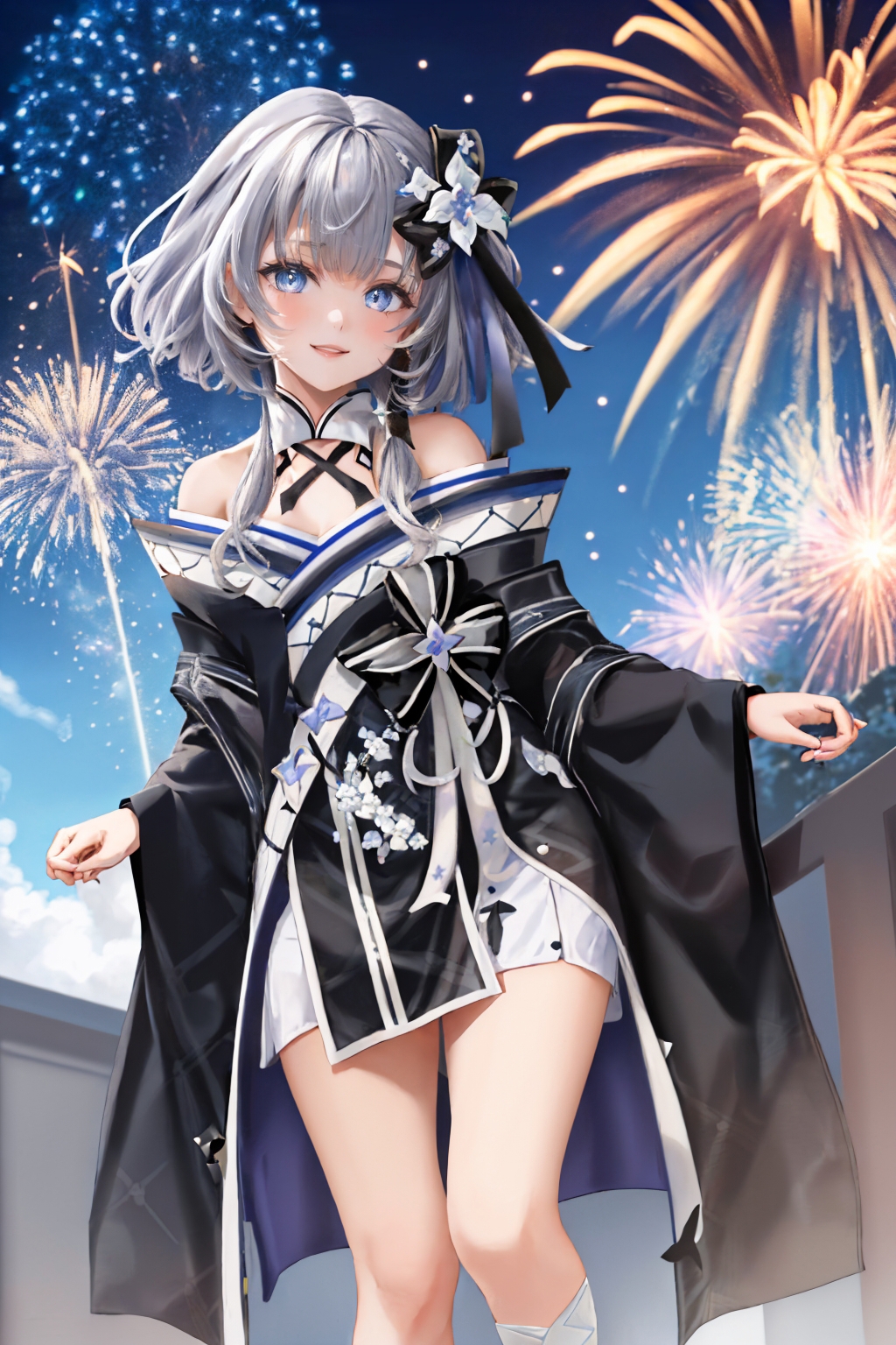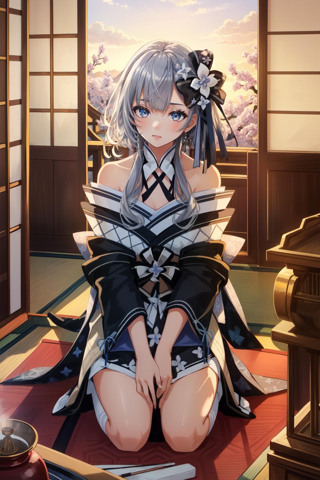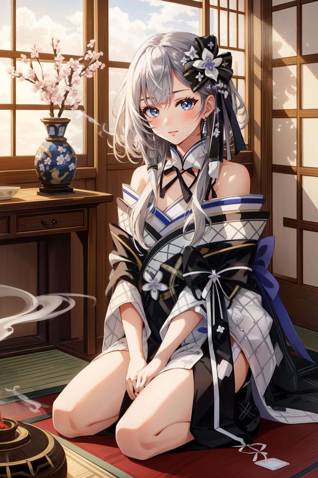 New Year: vestianewyr, hair bow, hair flower, japanese clothes, black kimono, off shoulder