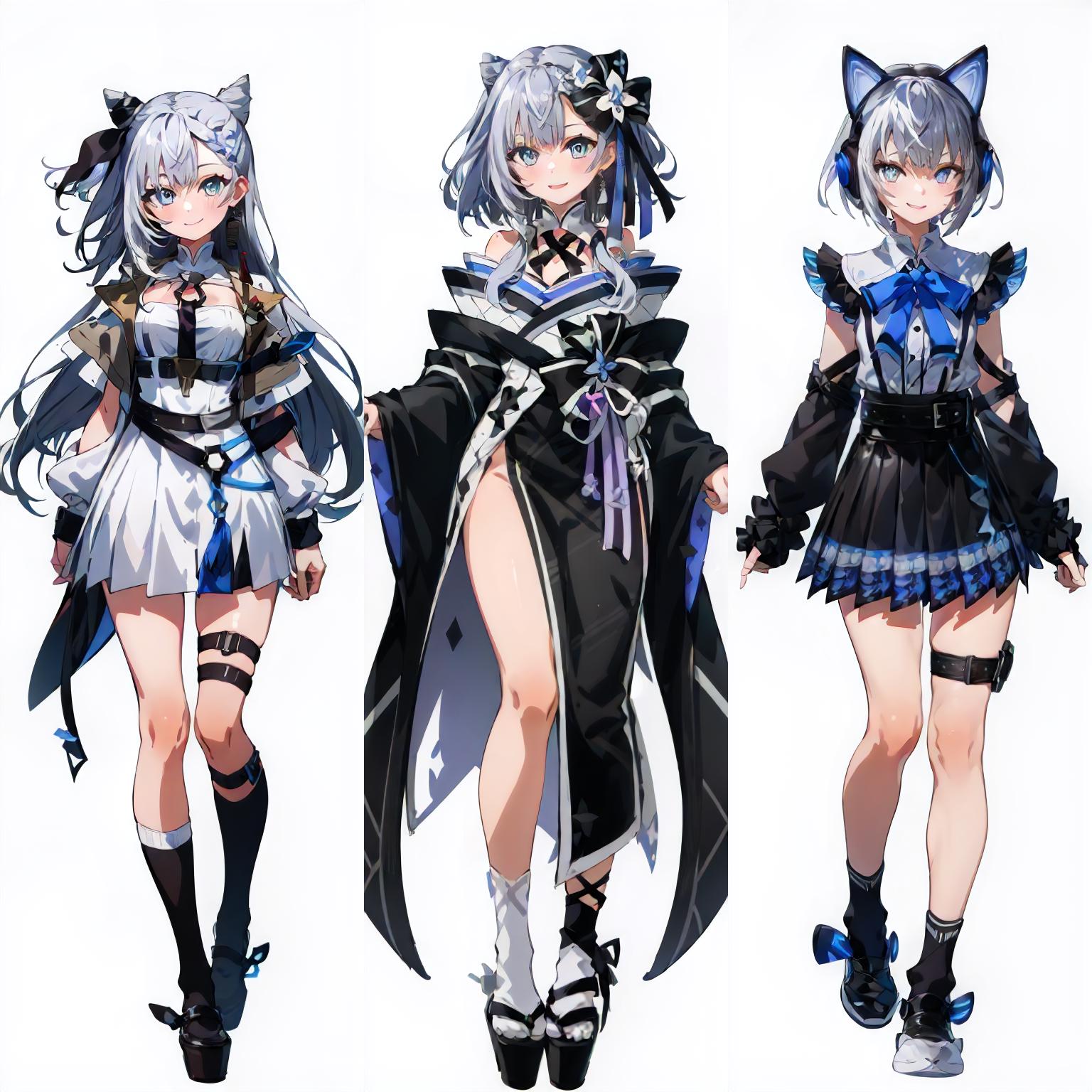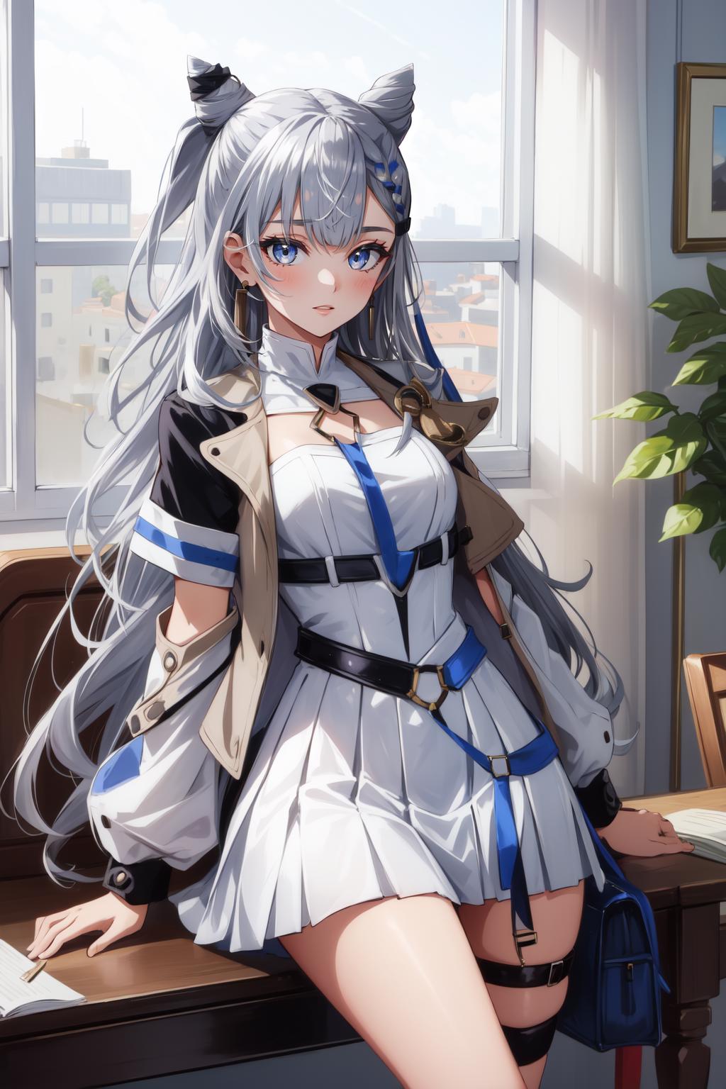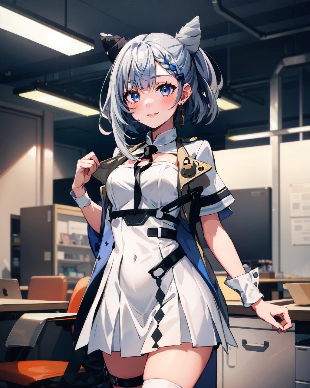 Default Outfit: white dress, single thighhigh, thigh strap