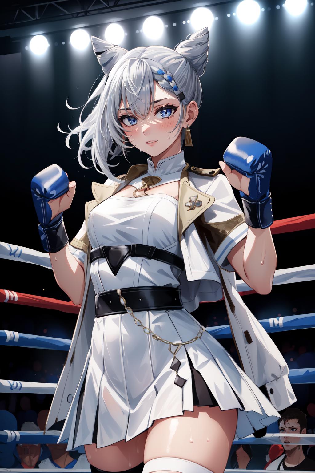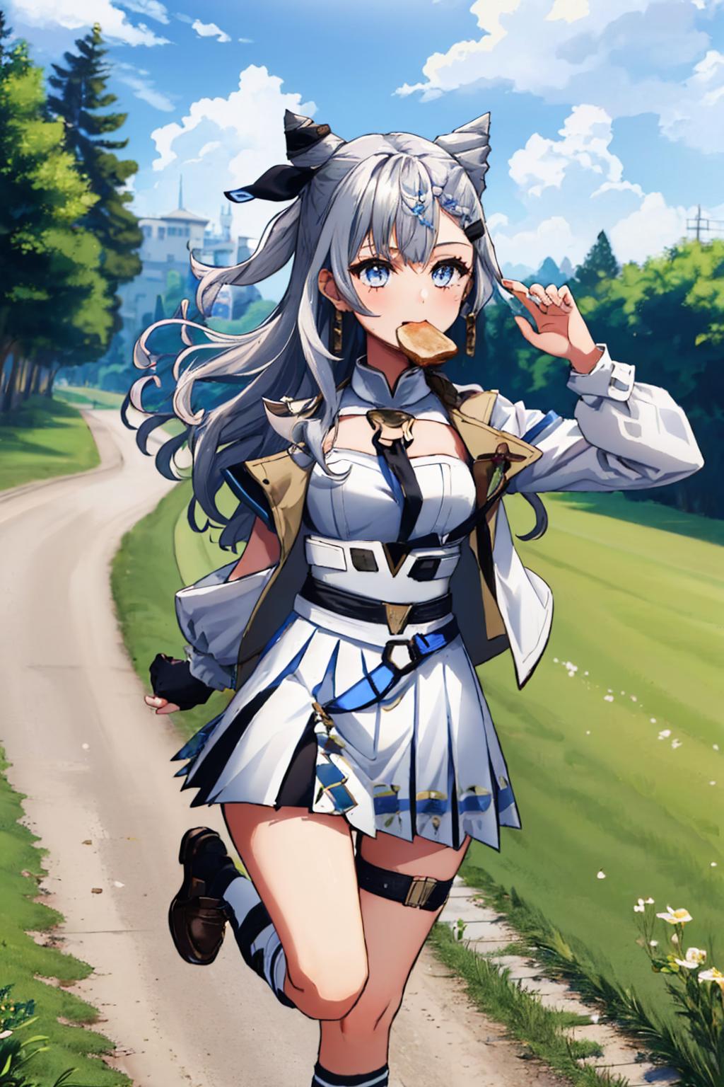 Default Outfit: vestiadef, braid, cone hair bun, jacket, white dress, single thighhigh, earrings