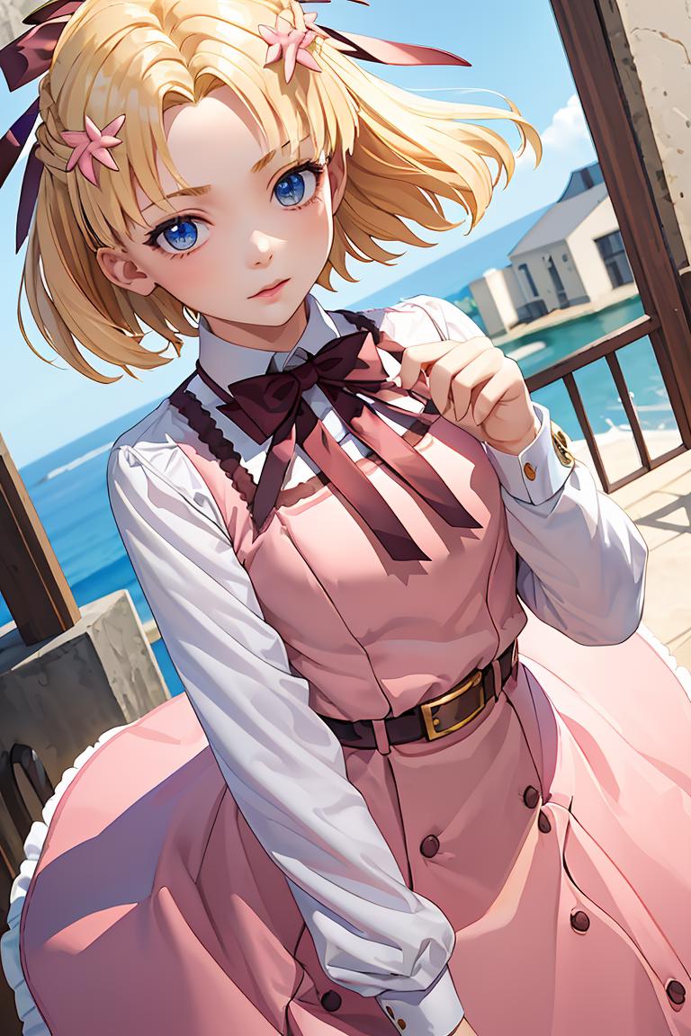 "pink dress, white sleeves, long sleeves, bow, belt"