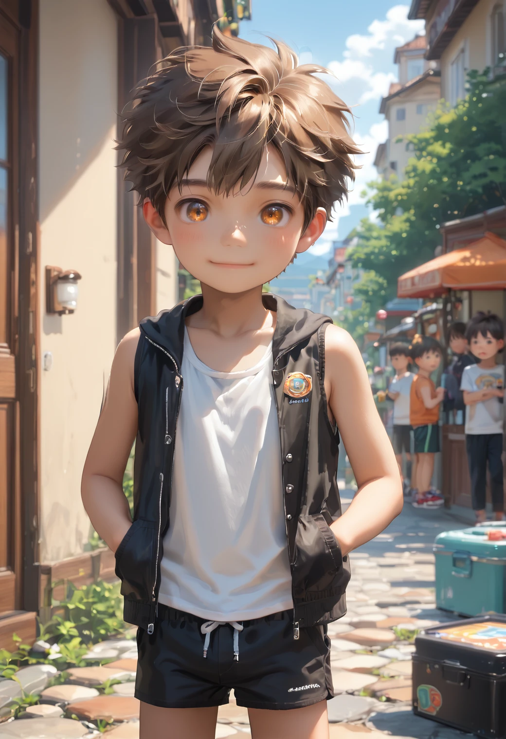 "male child, closed mouth, barefoot, open mouth"