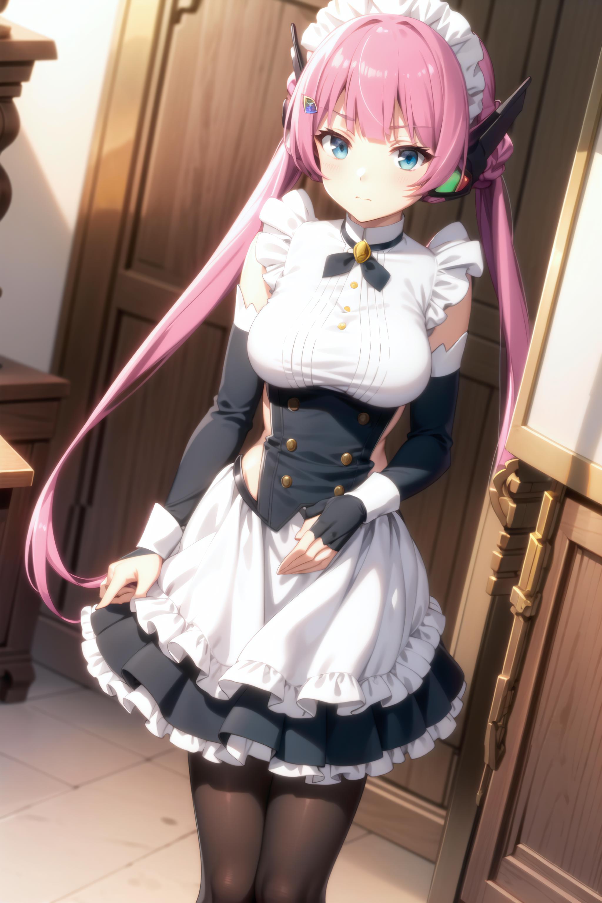 pink hair, long hair, twintails, blue eyes, robot ears