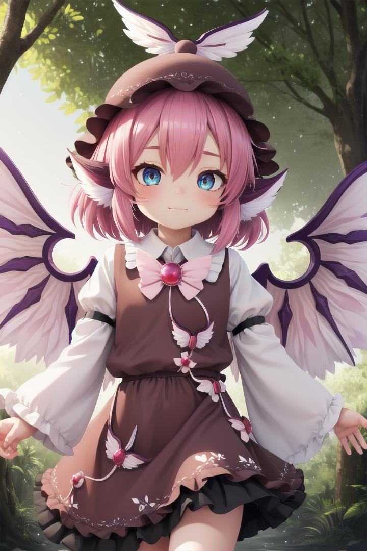 1girl,hat,pink hair,dress, animal ears,wide sleeves, wings