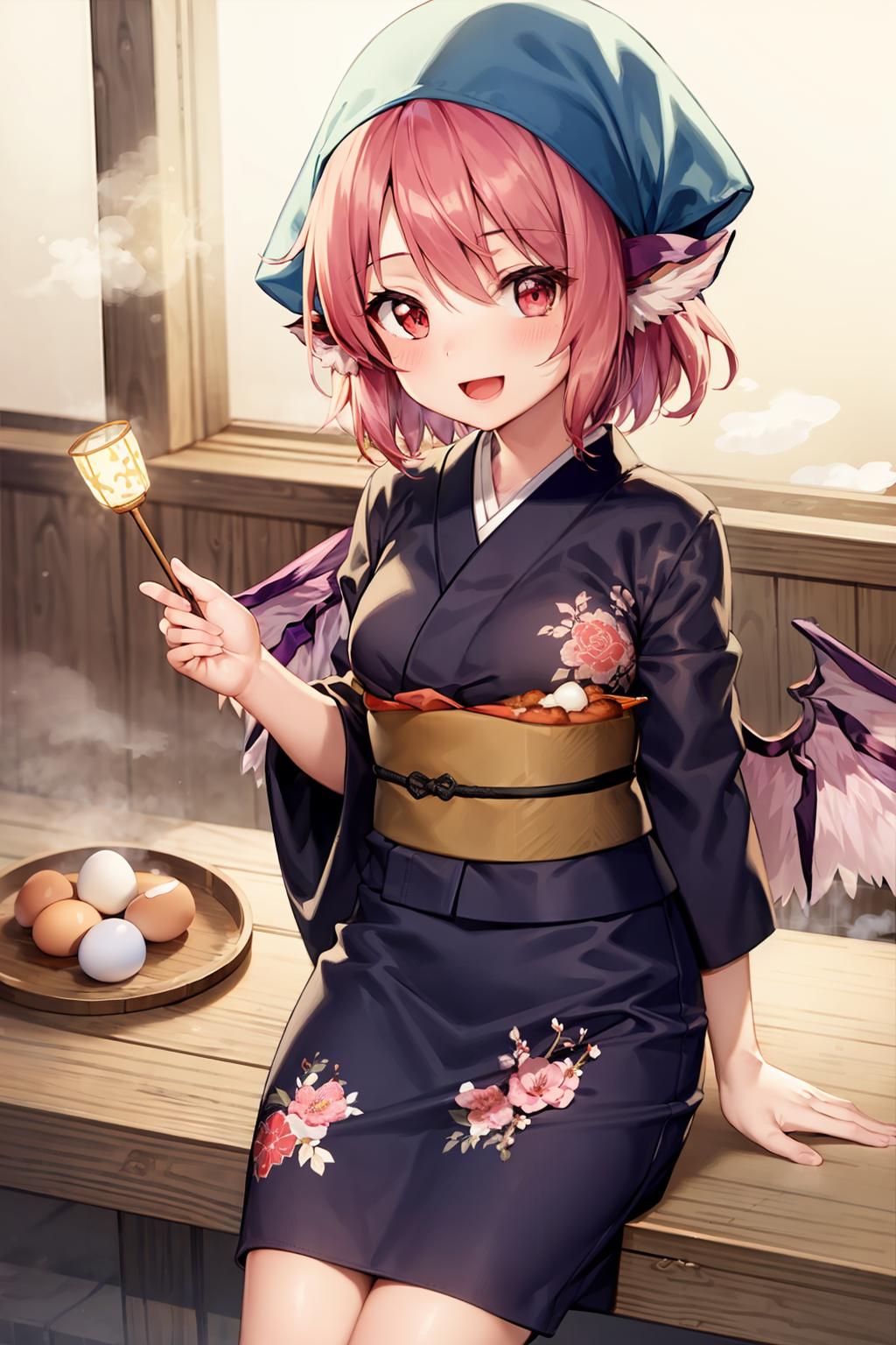 1girl,, okamisty, animal ears, wings, head scarf, japanese clothes, short hair, pink hair,