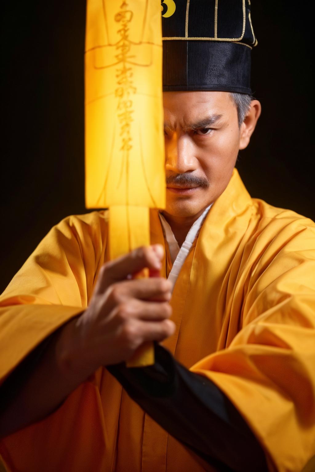 Optional Prompt(可選): 1boy, black_headwear, coat, robe, holding, fulu, sword, sword_finger