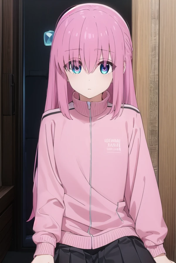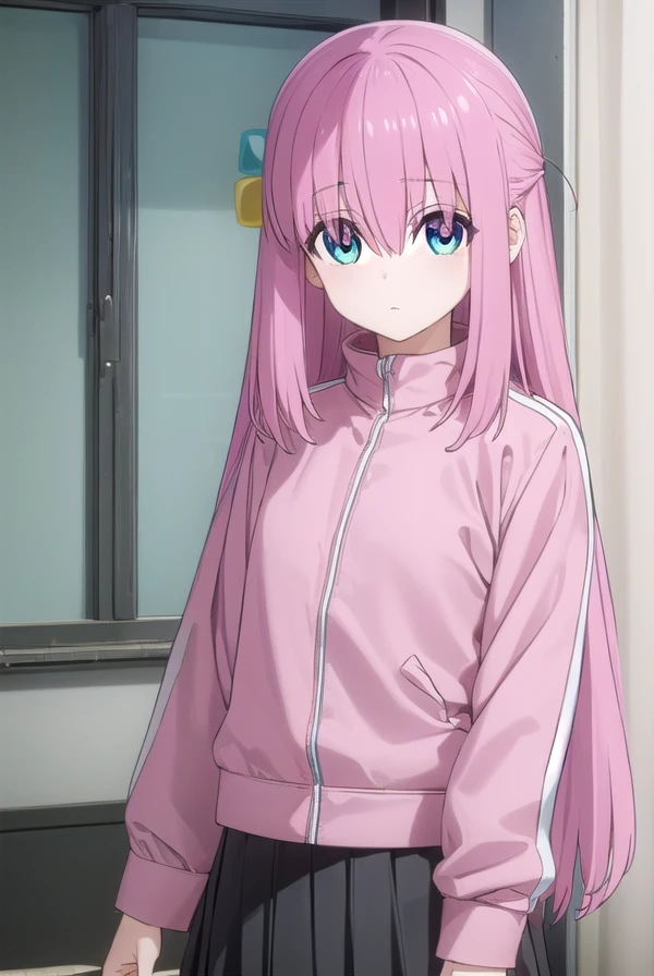 black skirt, jacket, long sleeves, pants, pants under skirt, (pink jacket:1.5), pink pants, pleated skirt, skirt, track jacket, track pants, track suit,