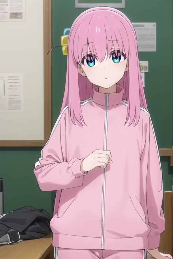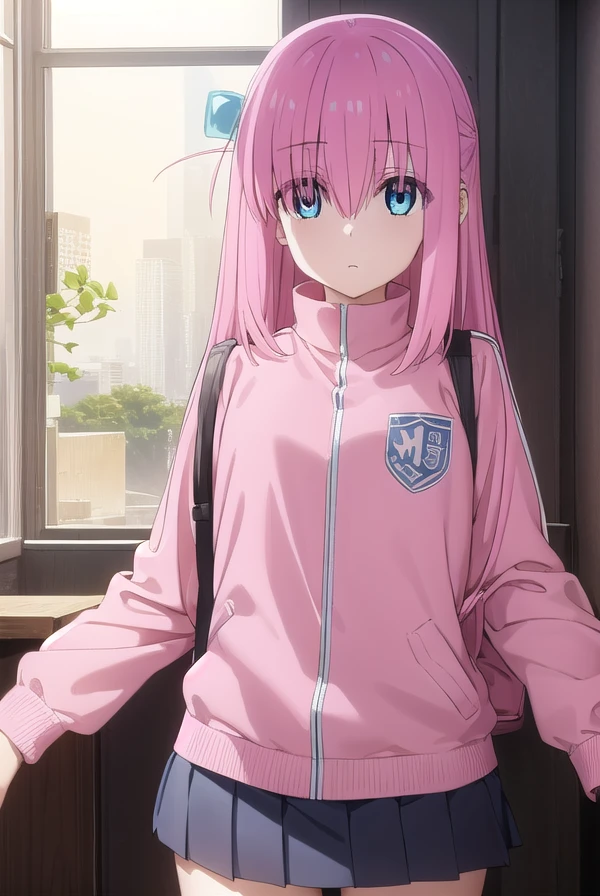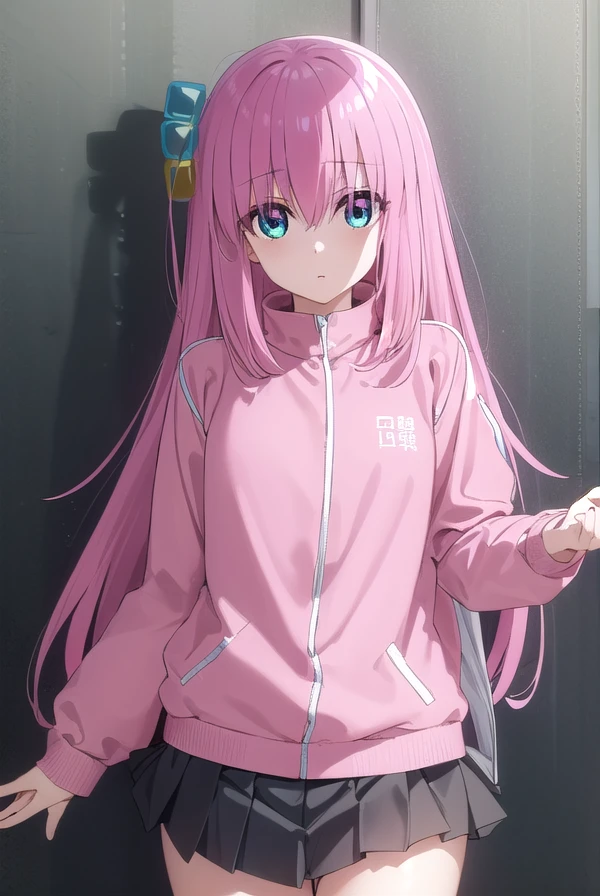 hitori gotou, blue eyes, cube hair ornament, hair between eyes, hair ornament, pink hair, one side up, long hair,