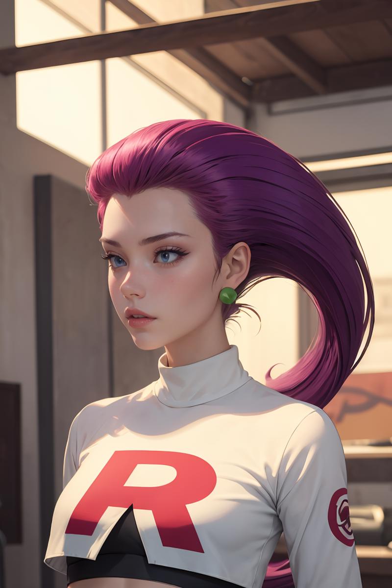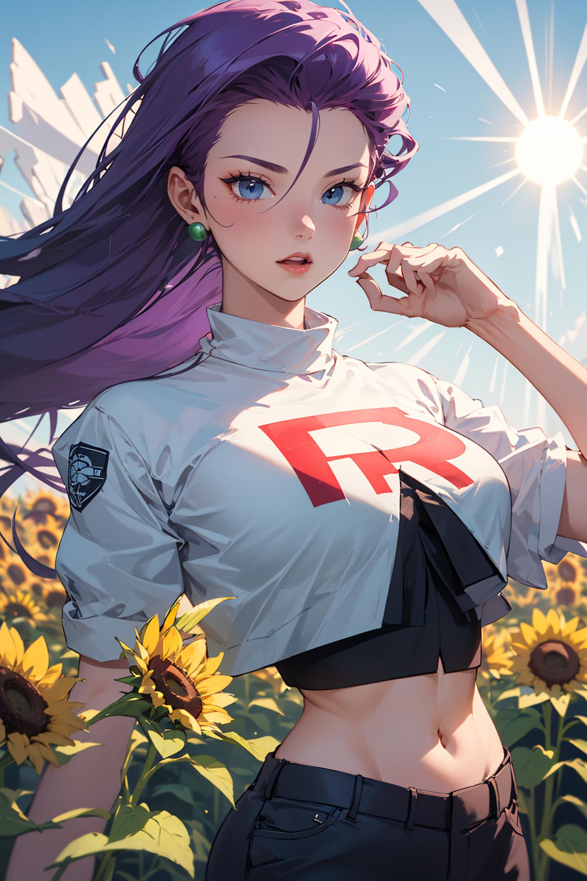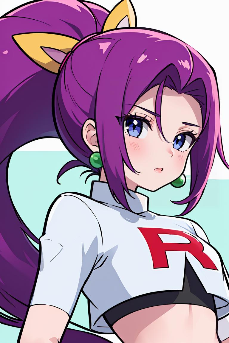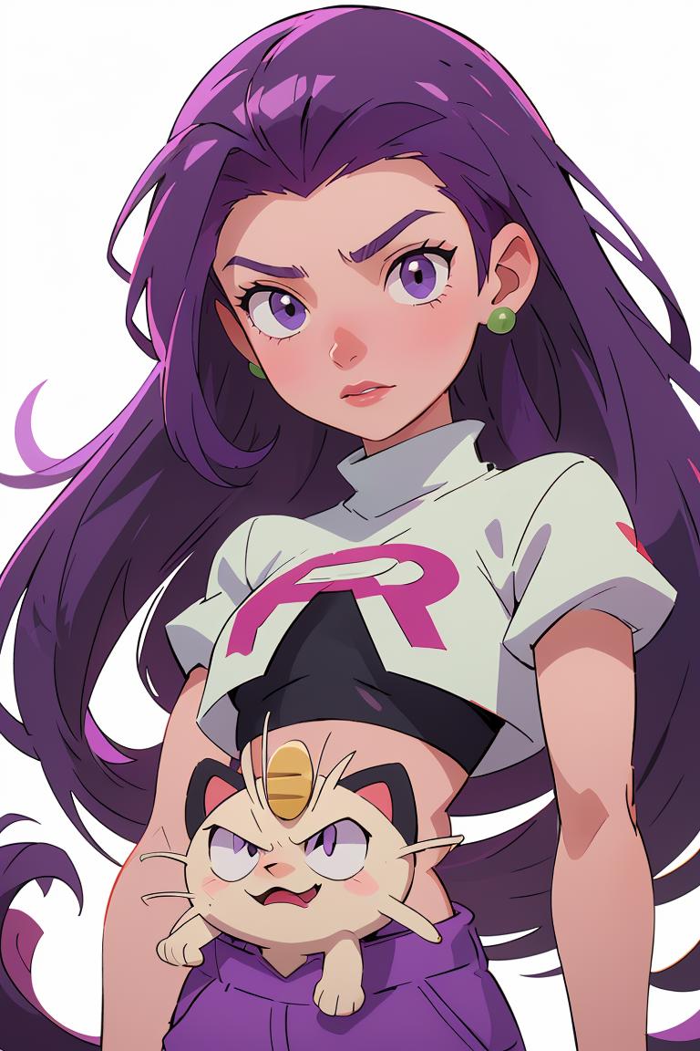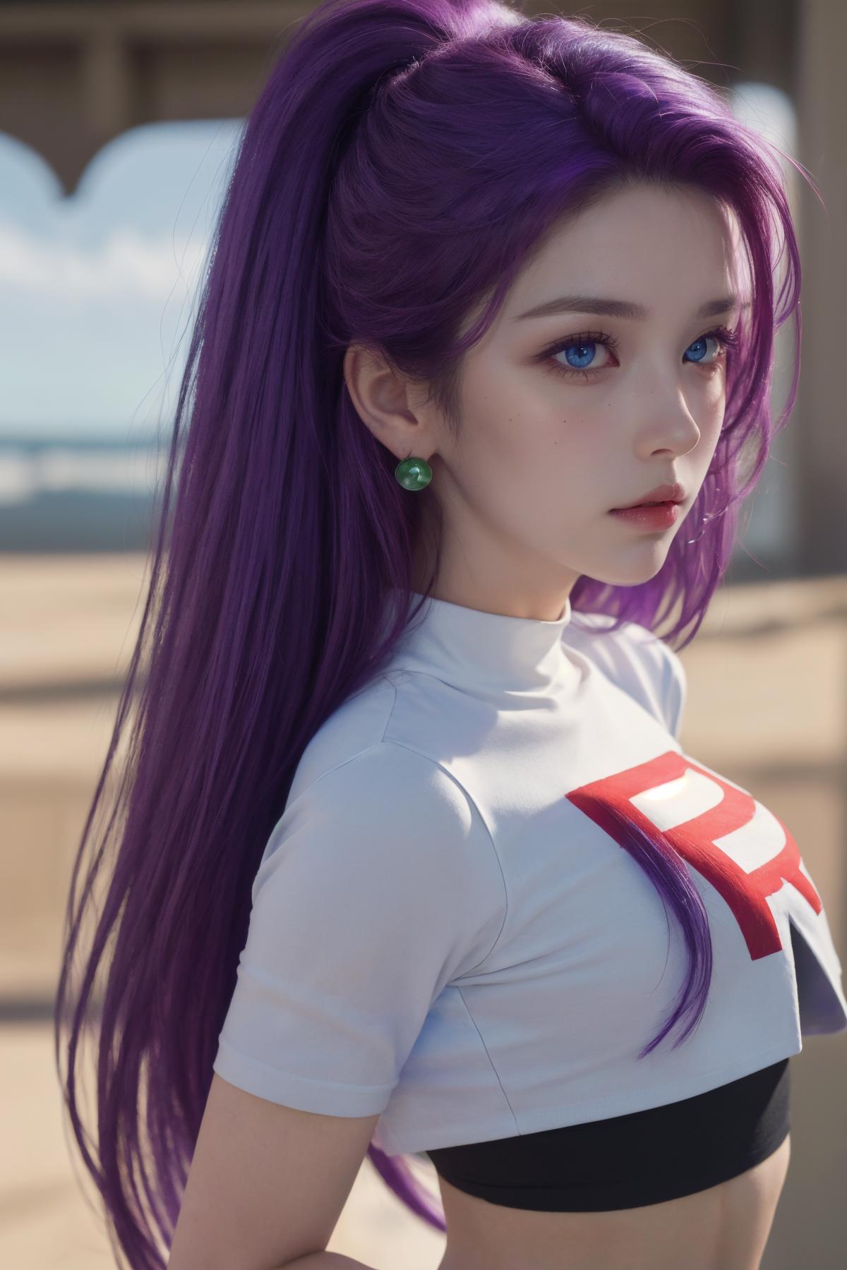 jessie_pokemon, earrings, team rocket uniform, crop top, very long hair, purple hair, hair slicked back