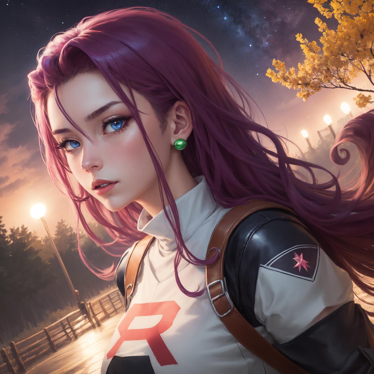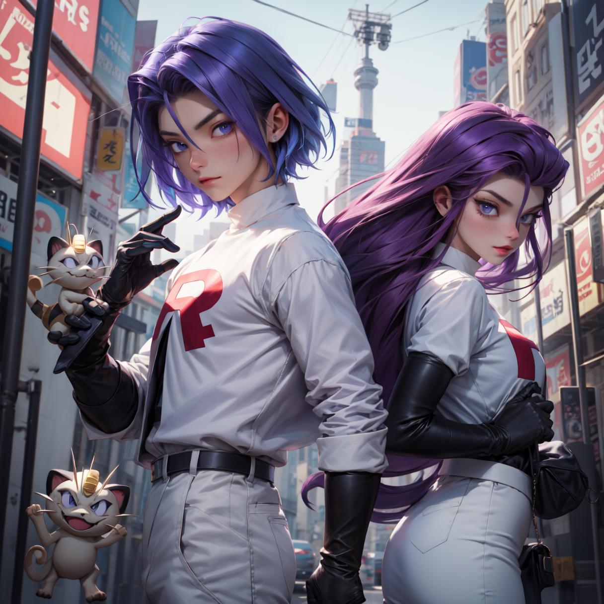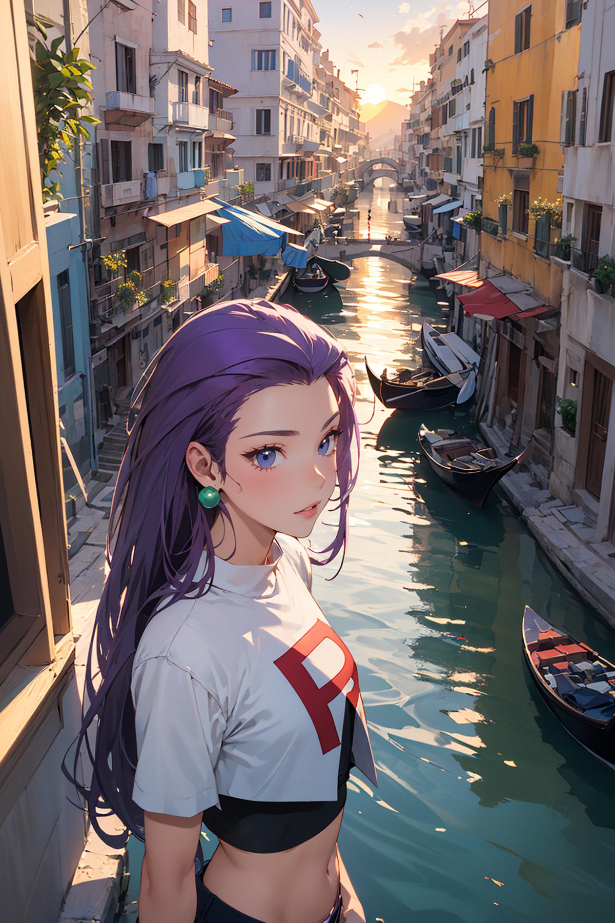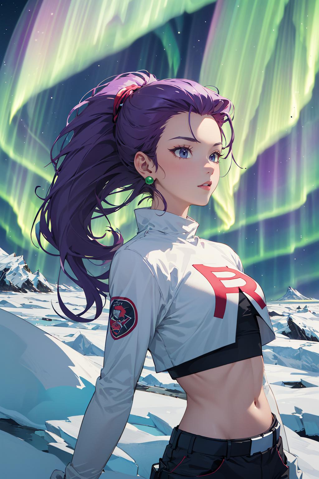 jessie_pokemon, earrings, team rocket uniform, crop top, very long hair, purple hair, hair slicked back