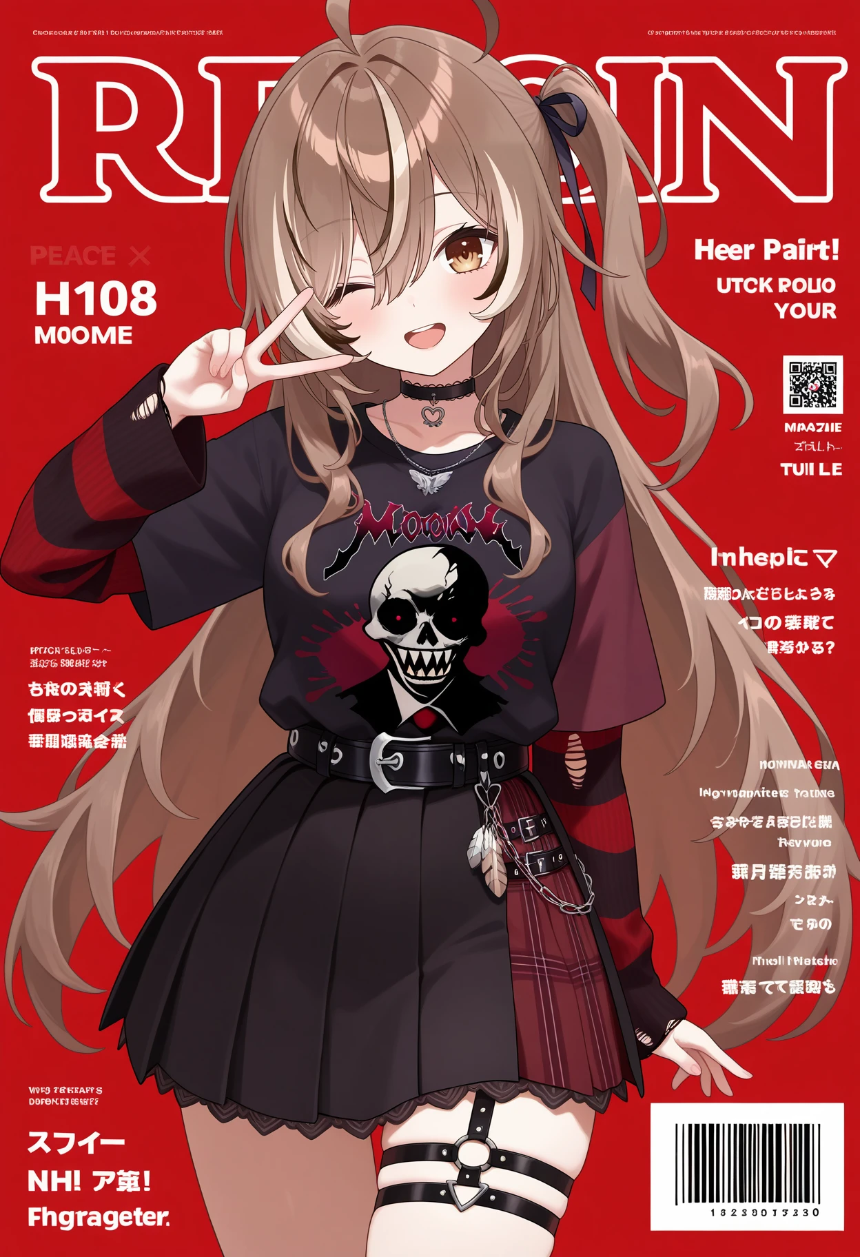 outfit4-1 (with black shirt, one side up)ddmumei, long hair, streaked hair, brown hair, one side up, hair ribbon, ahoge, brown eyes, black choker, necklace, torn clothes, print shirt, black shirt, striped sweater, red sweater, short over long sleeves, black belt, overskirt, pleated skirt, black skirt, thigh strap