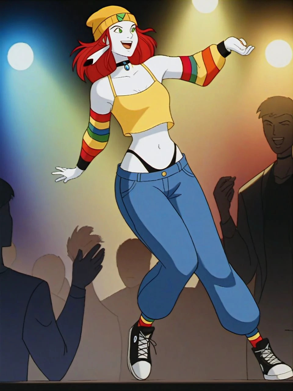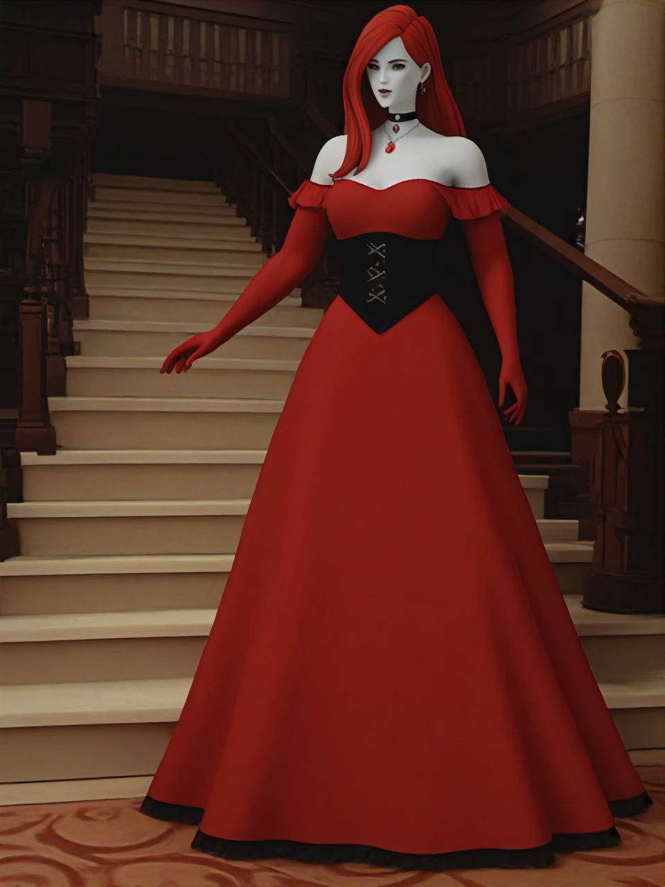 helper tags: colored skin, (long) red hair, green eyes