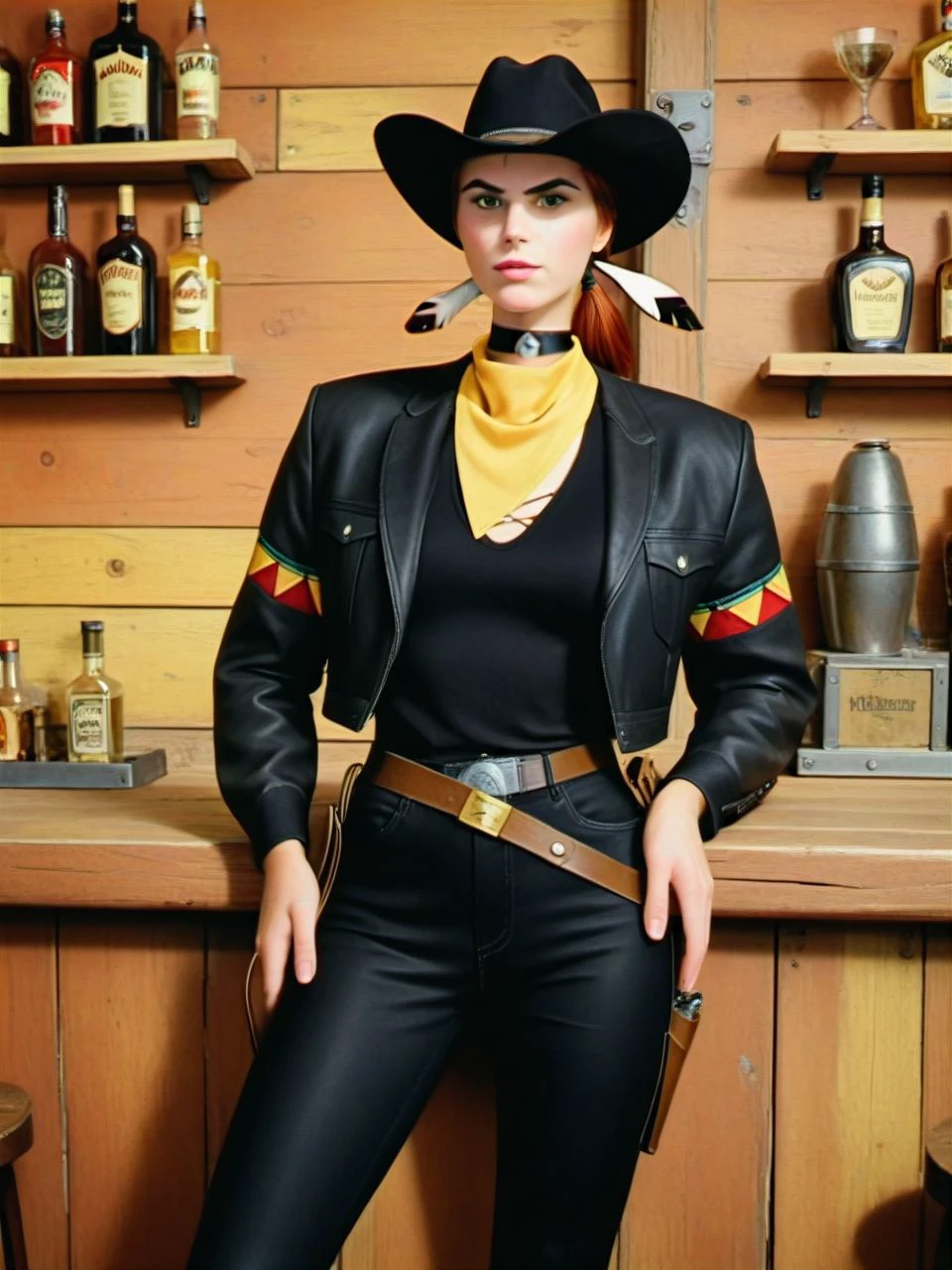 accessories: feather hair ornament, choker, (yellow) neckerchief, belt, holster, cowboy hat