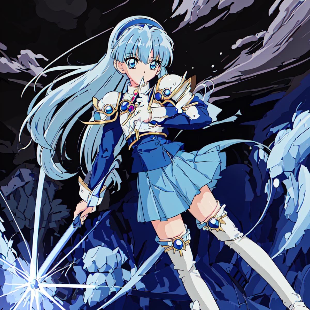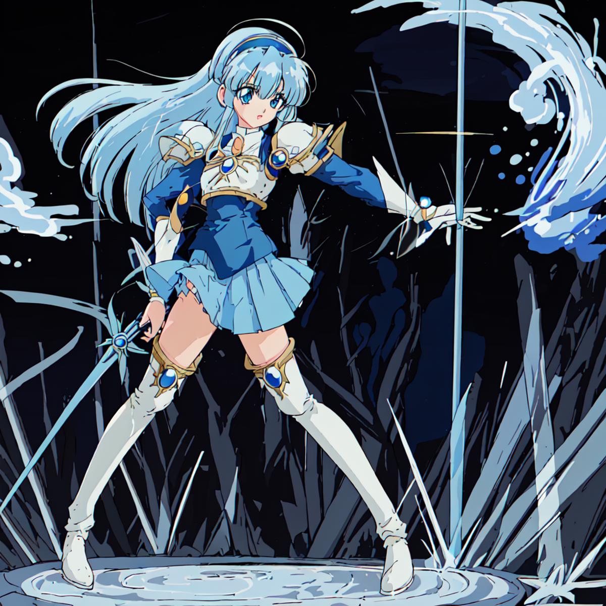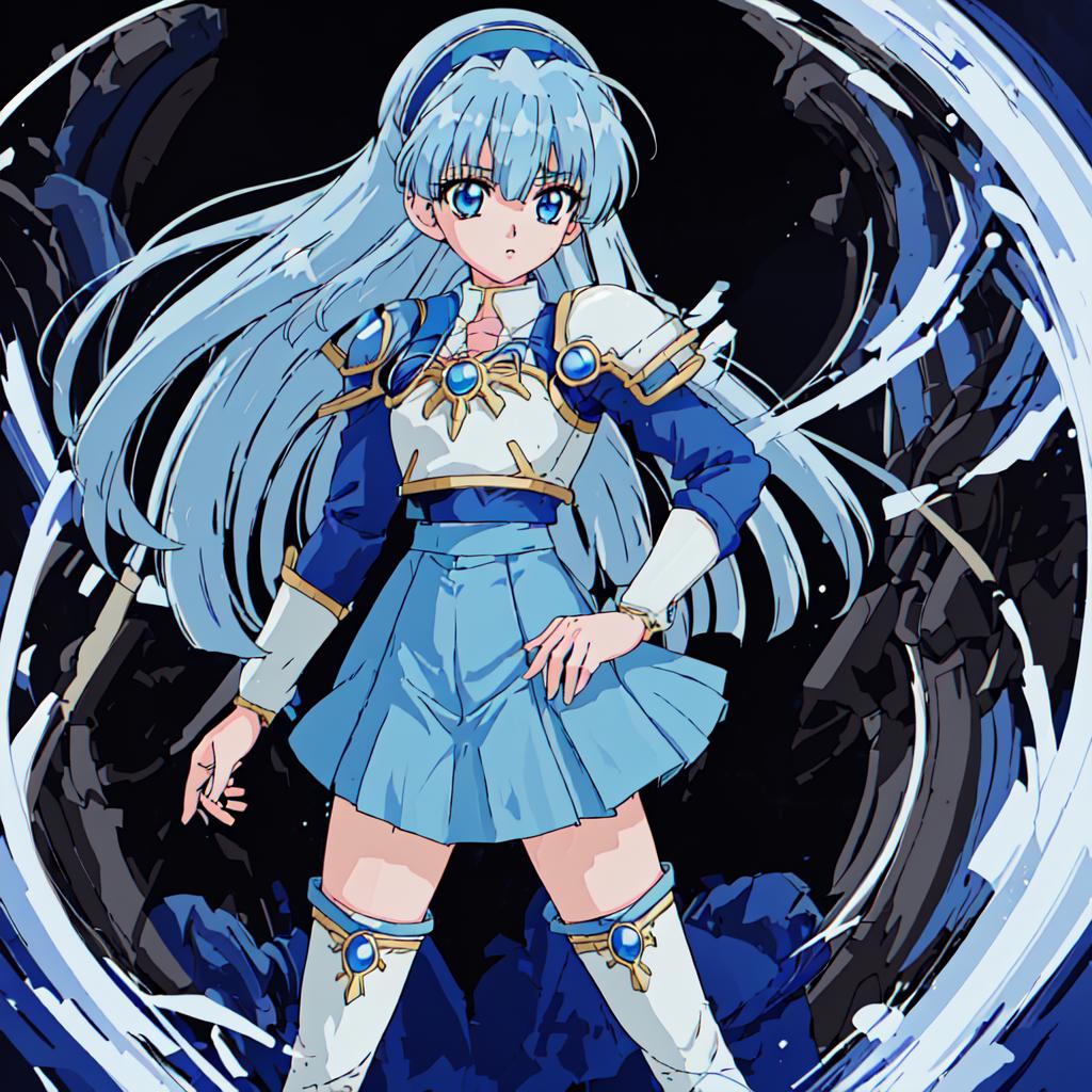 Umi Ryuuzaki : <lora:Magic_Knight_Rayearth-10:1>Magic_Knight_Rayearth, 1girl, solo, long hair, blue hair, white armor, blue skirt, zettai ryouiki, thigh boots, white boots, blue hairband,blue eyes, school uniform,blunt bangs,blazer, blue jacket,shoulder armor,sharp eyes