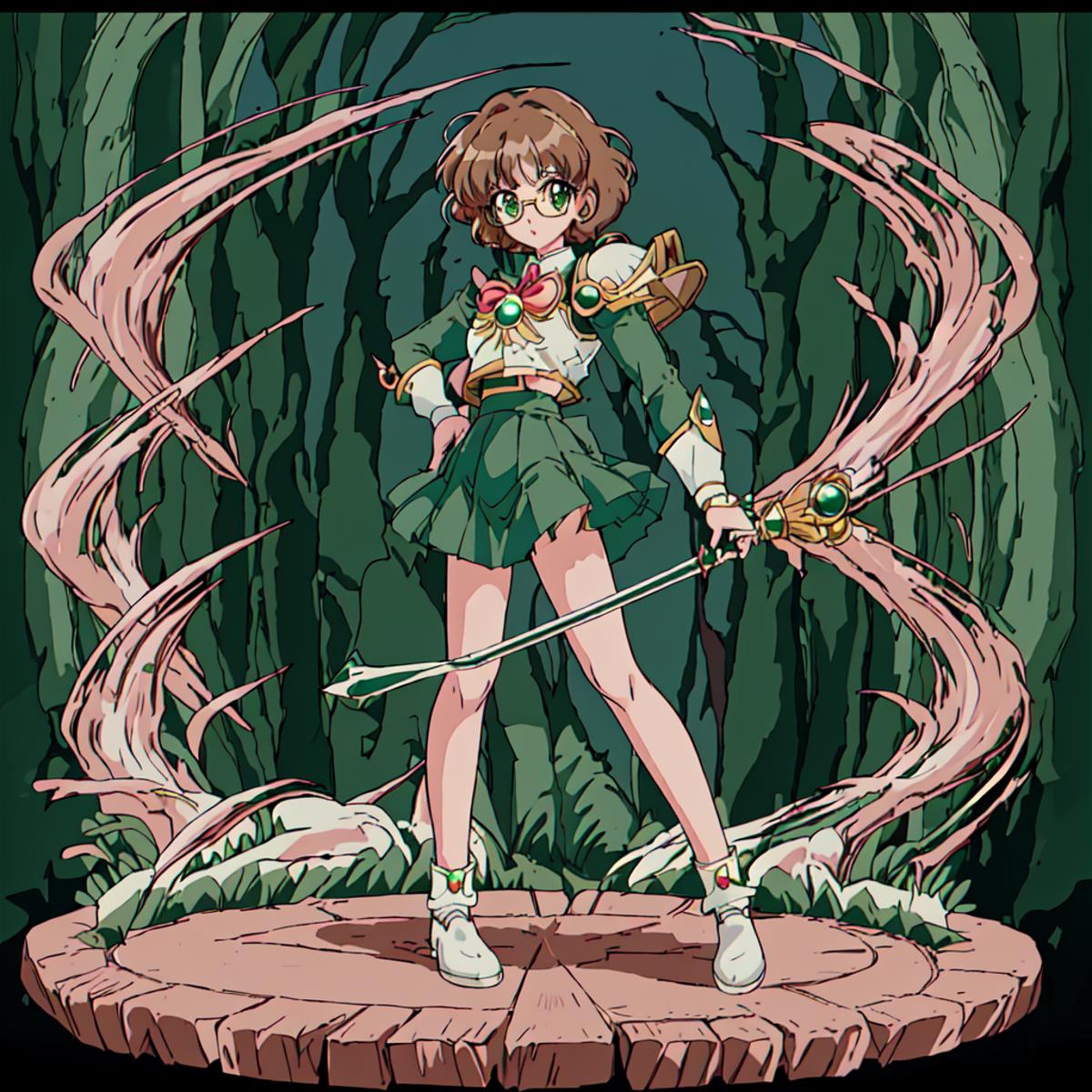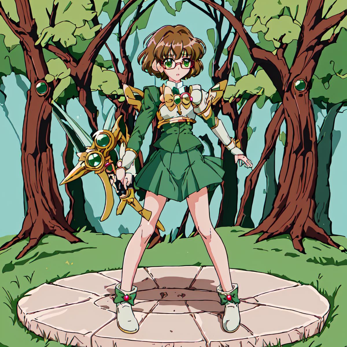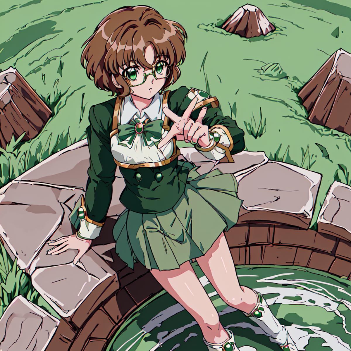 Fuu Hououji : <lora:Magic_Knight_Rayearth-10:1>Magic_Knight_Rayearth, 1girl, solo, short hair, green skirt, pleated skirt, brown hair, bow, school uniform, green eyes, white shoes,round eyewear,rimless eyewear,green skirt