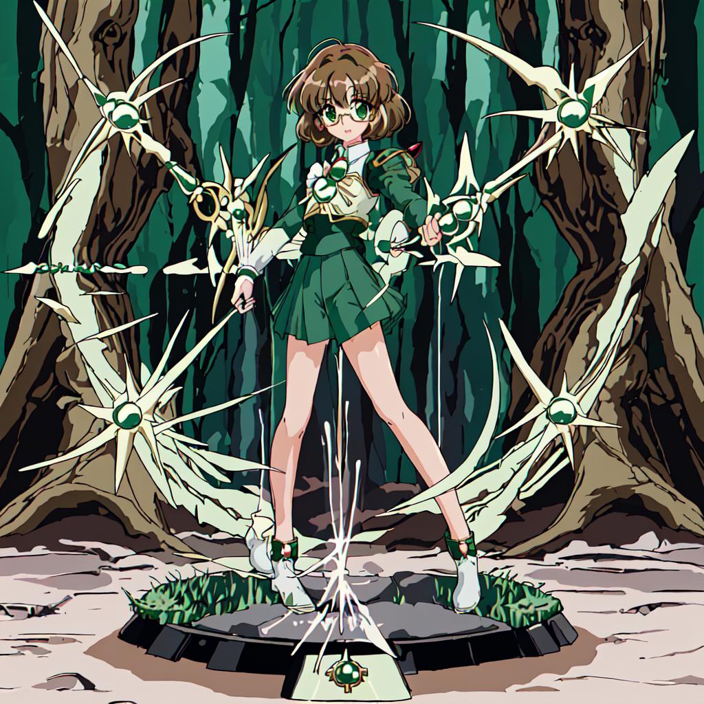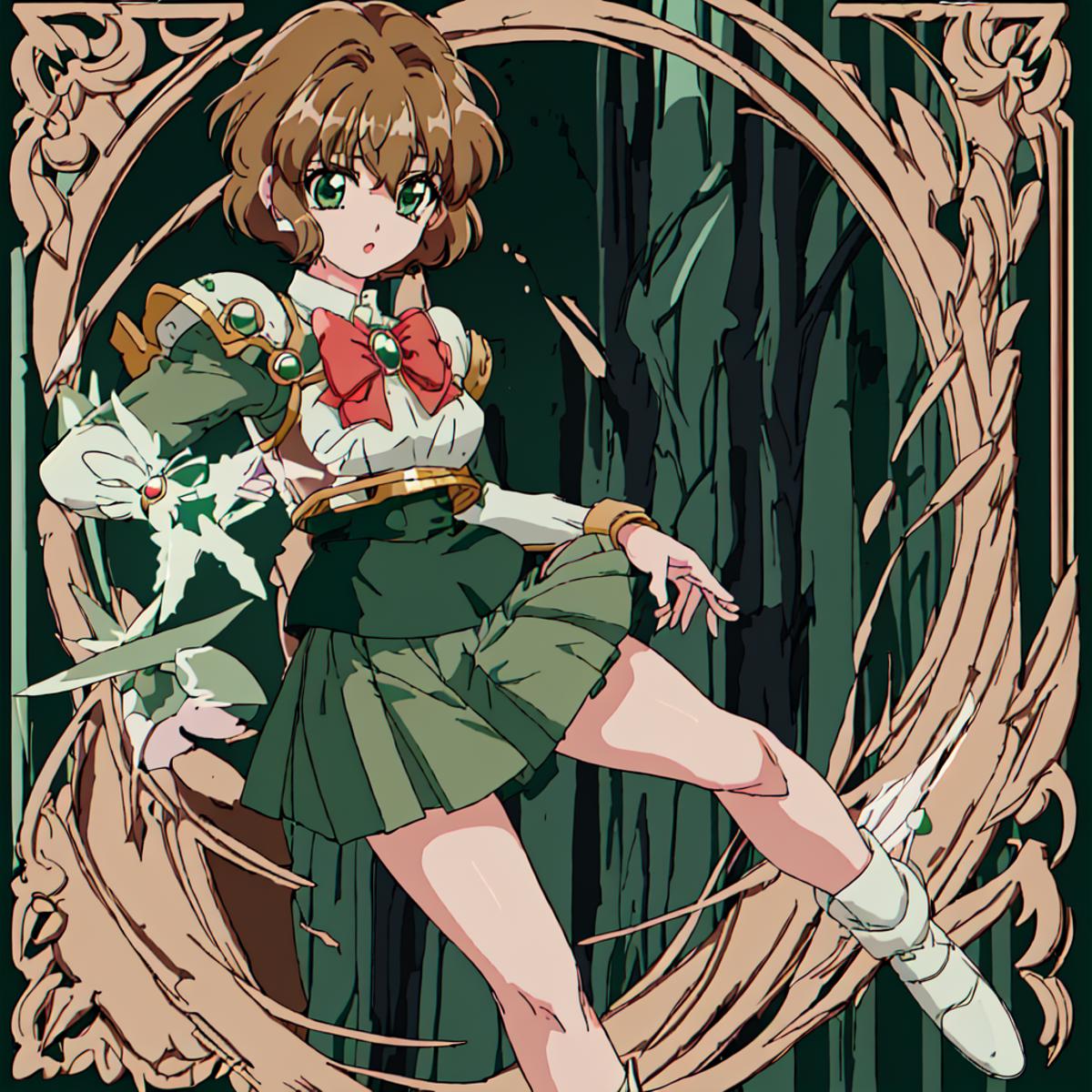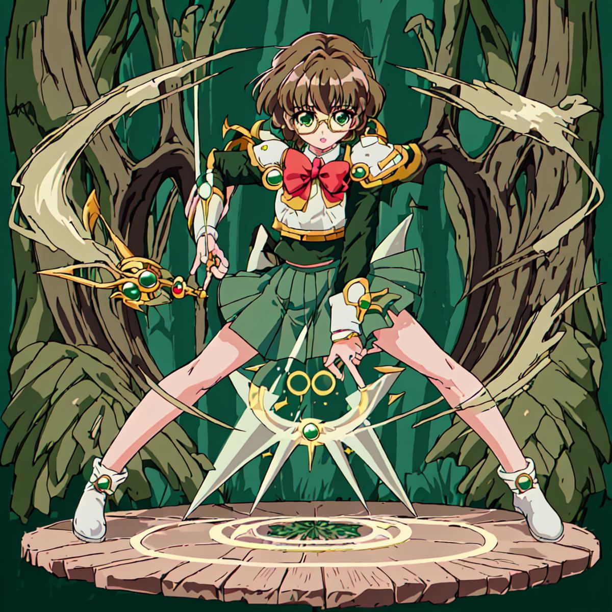 Fuu Hououji : <lora:Magic_Knight_Rayearth-10:1>Magic_Knight_Rayearth, 1girl, solo, short hair, green skirt, pleated skirt, brown hair, bow, school uniform, green eyes, white shoes,round eyewear,rimless eyewear,green skirt