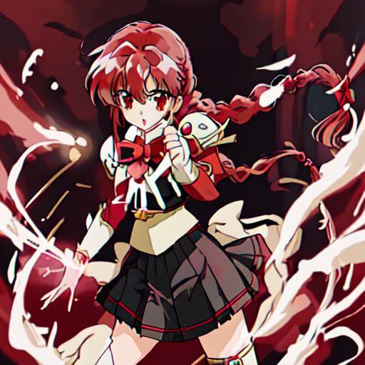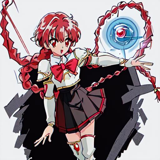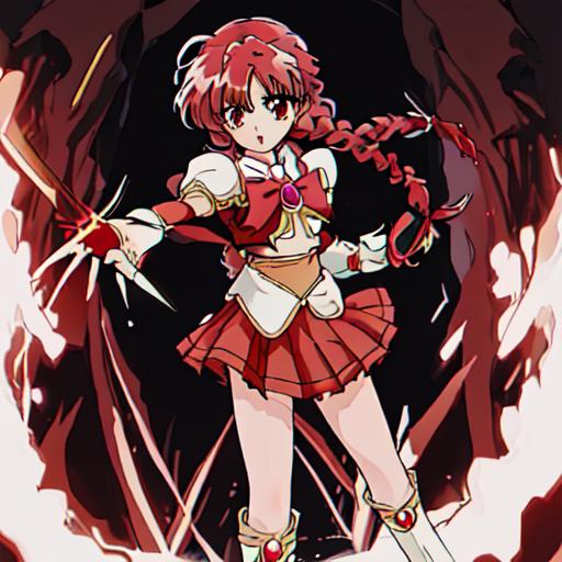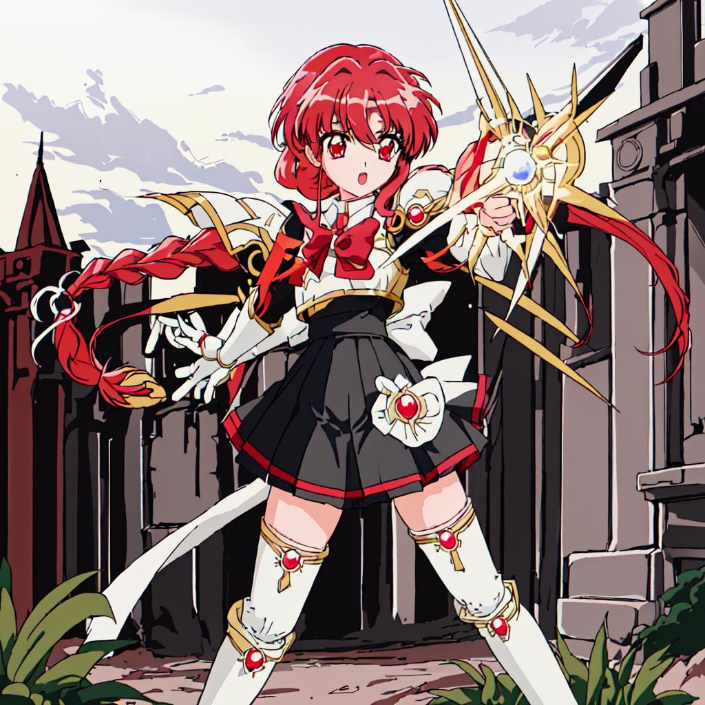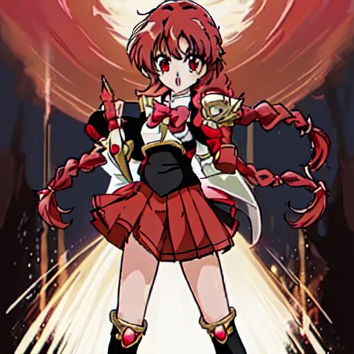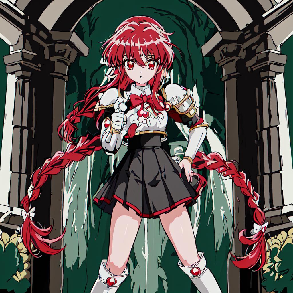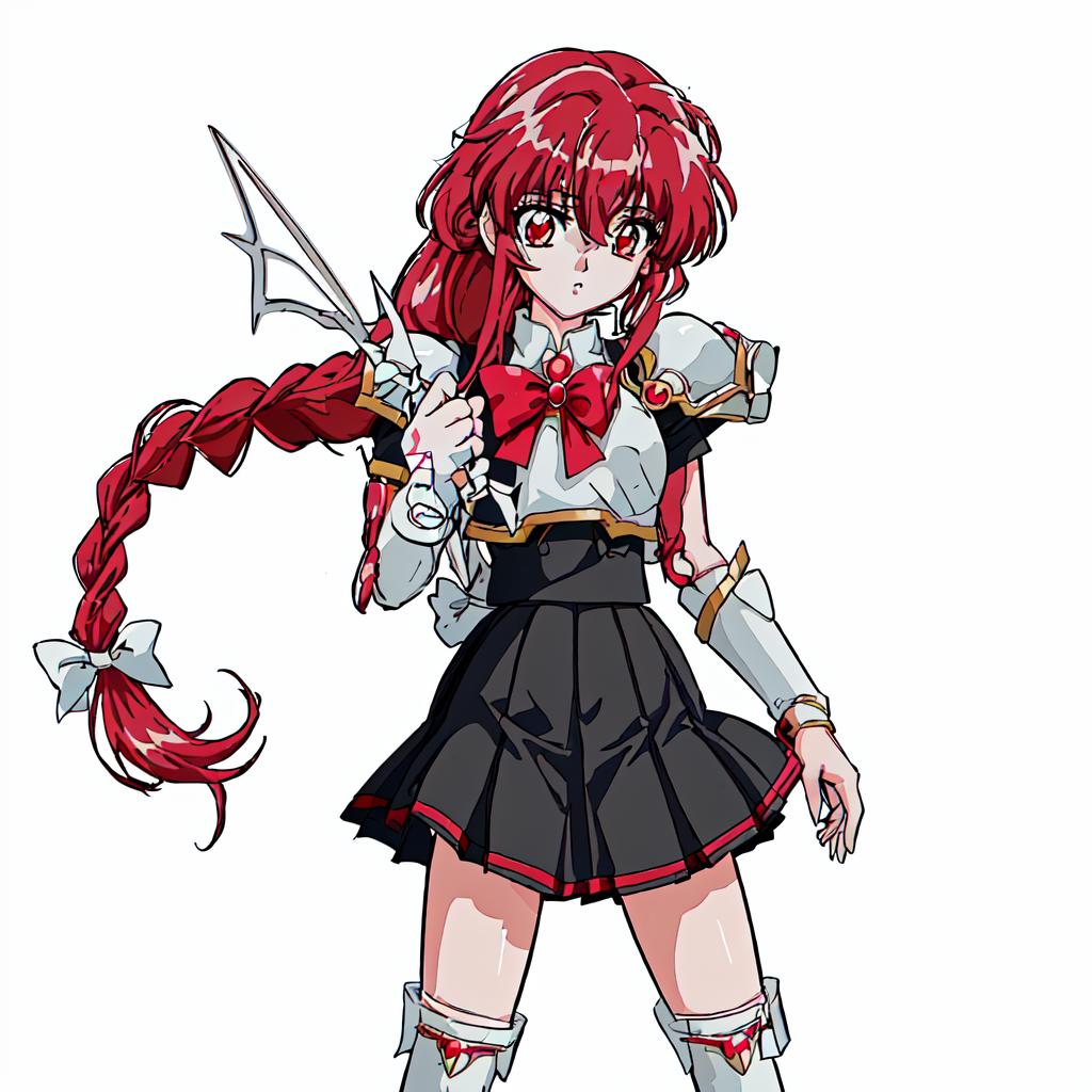 Hikaru Shidou : <lora:Magic_Knight_Rayearth-10:1>Magic_Knight_Rayearth, 1girl, solo, long hair, red eyes, white bow, school uniform, red hair, pleated skirt, single braid, knee boots,black skirt,white boots,white armor