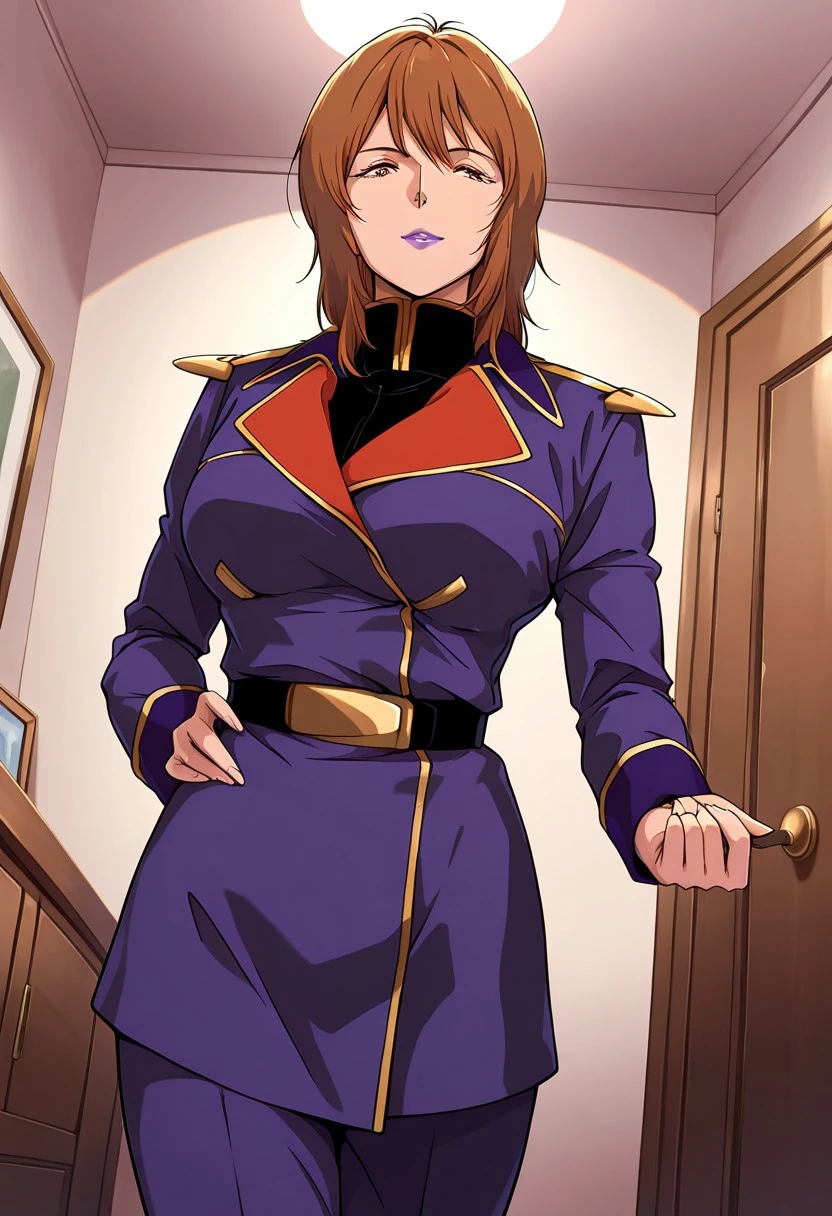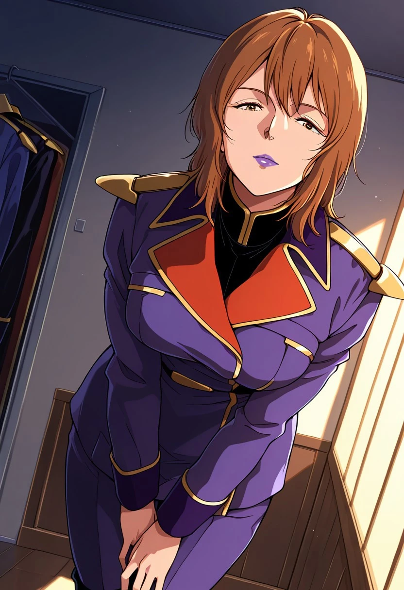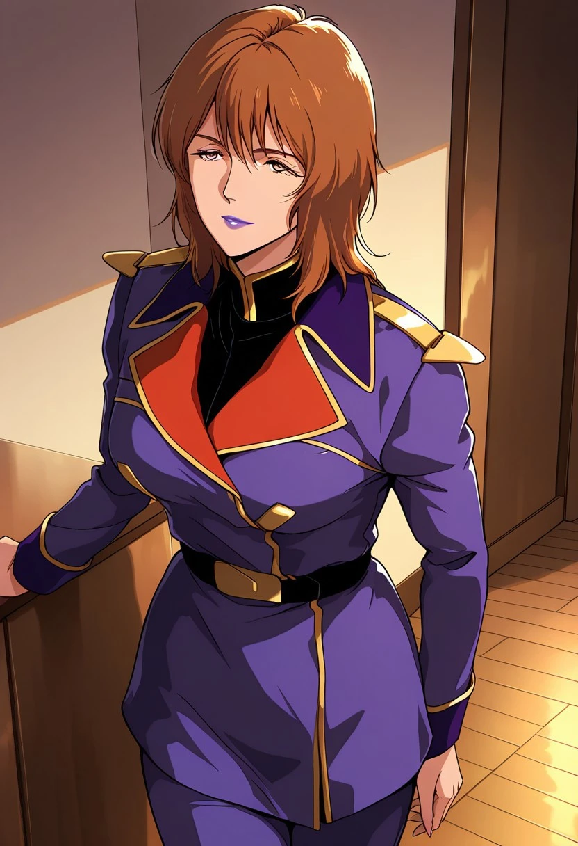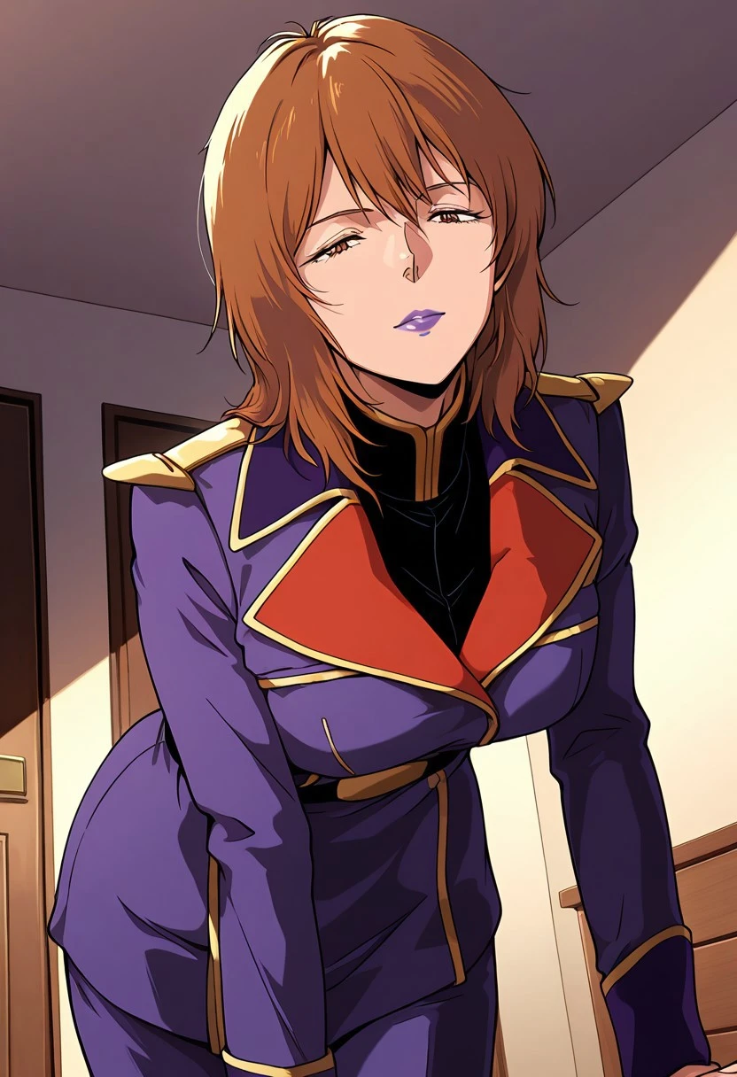 rezin, 1 mature female, brown hair,short hairstyle, purple lips,