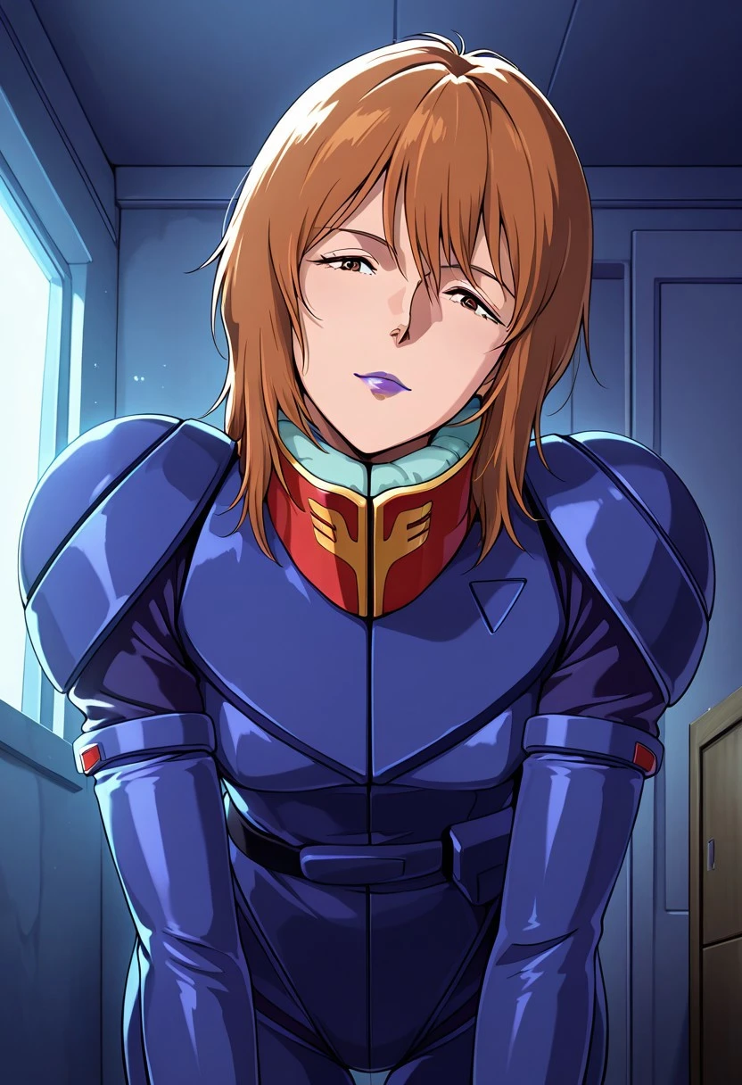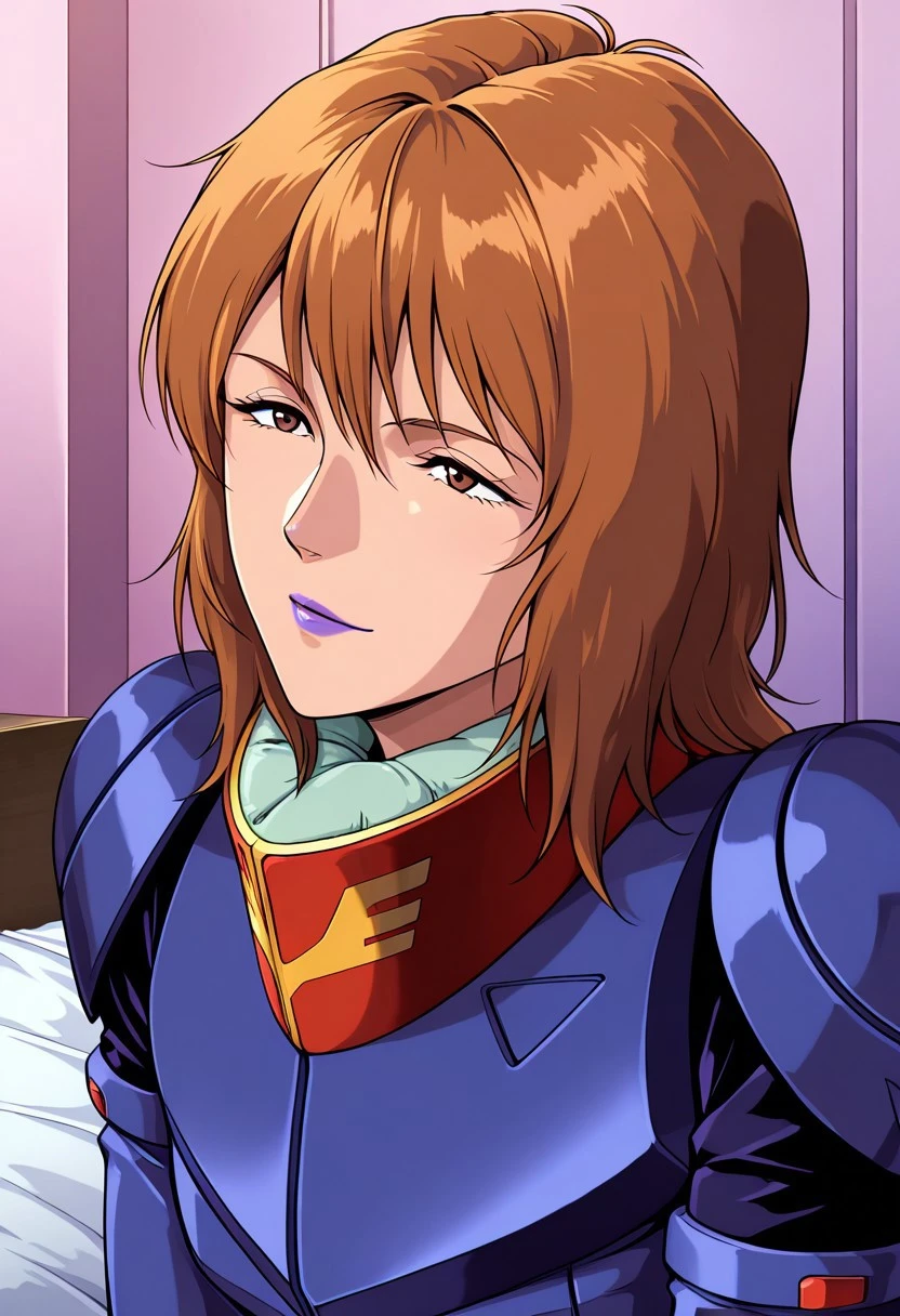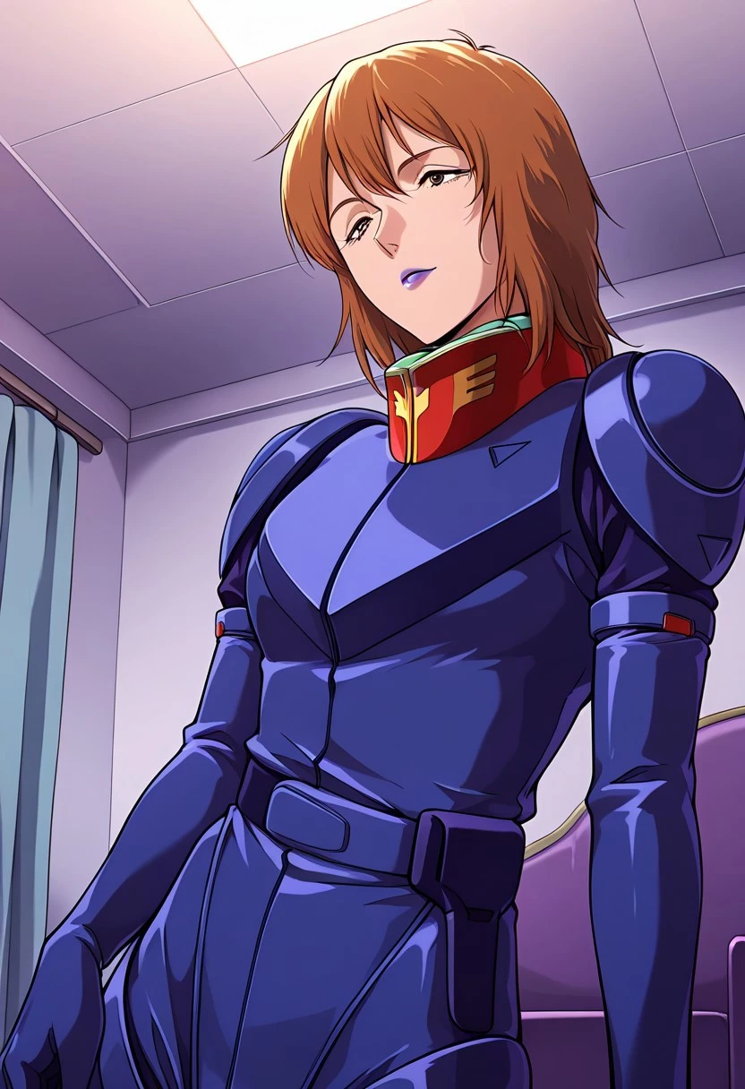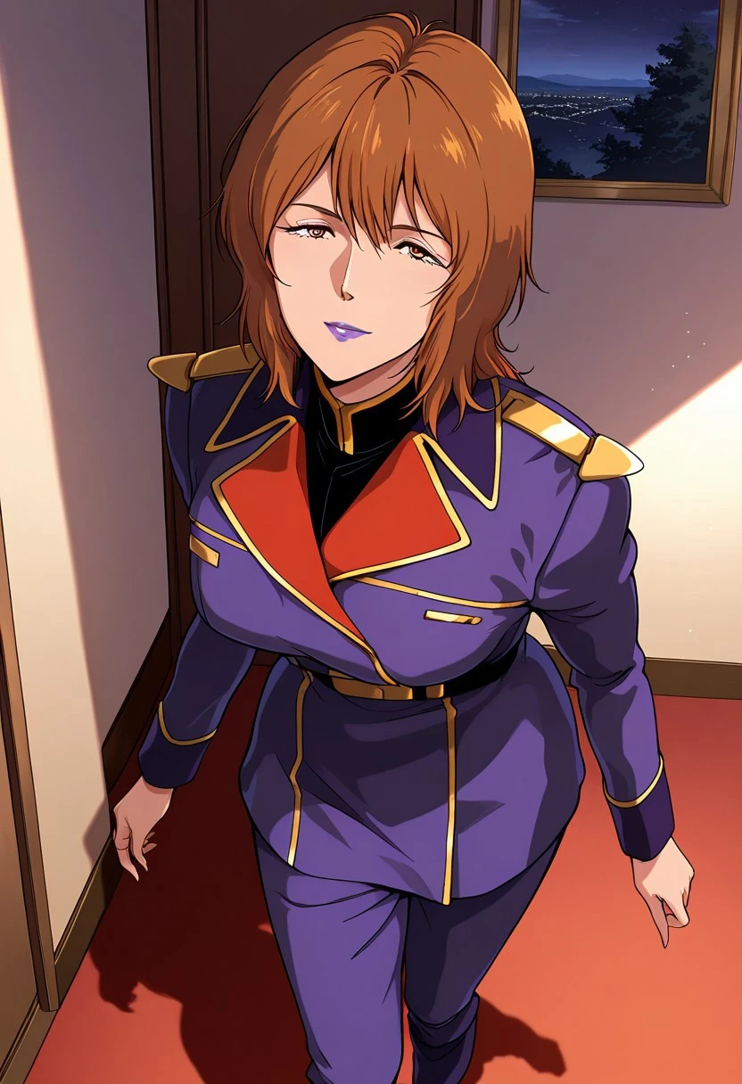 rezin, 1 mature female, brown hair,short hairstyle, purple lips,