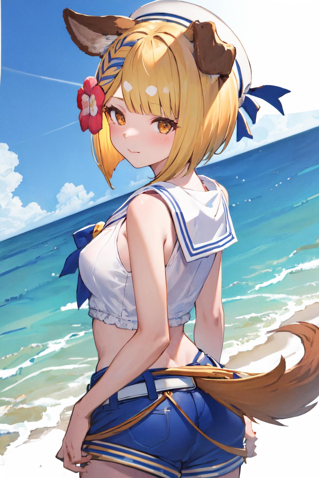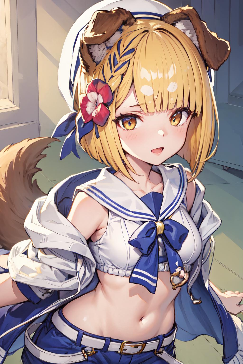 vajrasu, dog tail, hair flower, blue shorts, white shirt, sailor collar, belt, white headwear, white sailor collar