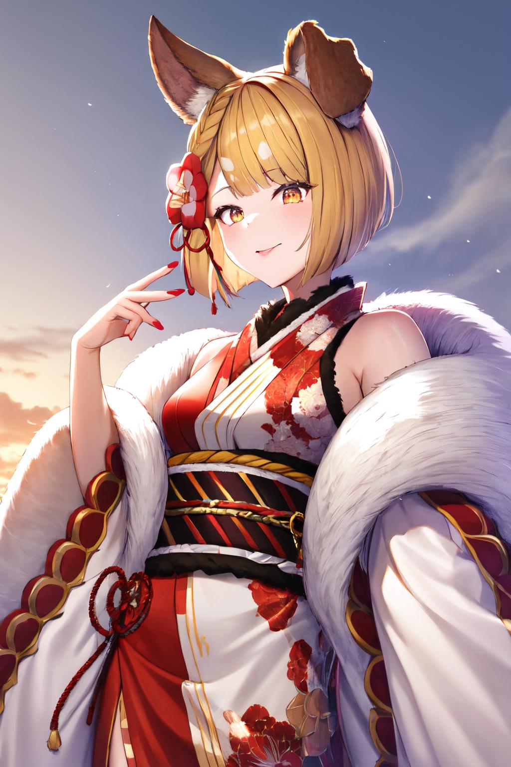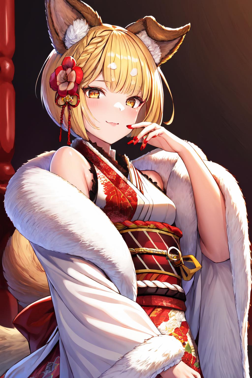 vajrarr, dog tail, red hair flower, red nails, white obi, white kimono, japanese clothes, floral print, white detached sleeves, wide sleeves, long sleeves, fur trim, sash