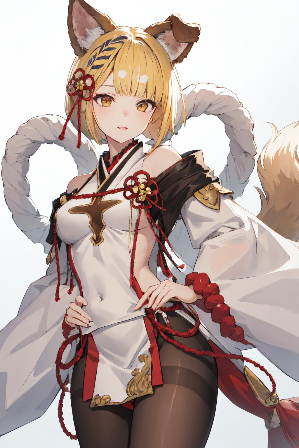 vajradef, dog tail, black pantyhose, hair ornament, japanese clothes, ???? shoulders, detached sleeves, wide sleeves, white pelvic curtain
