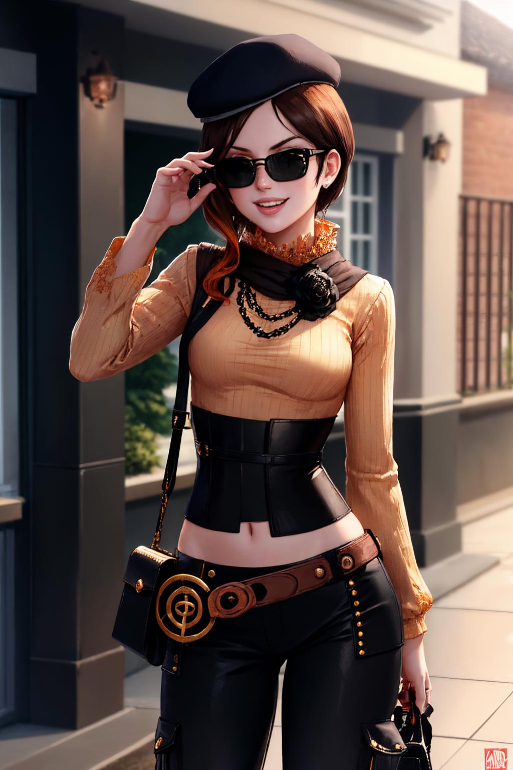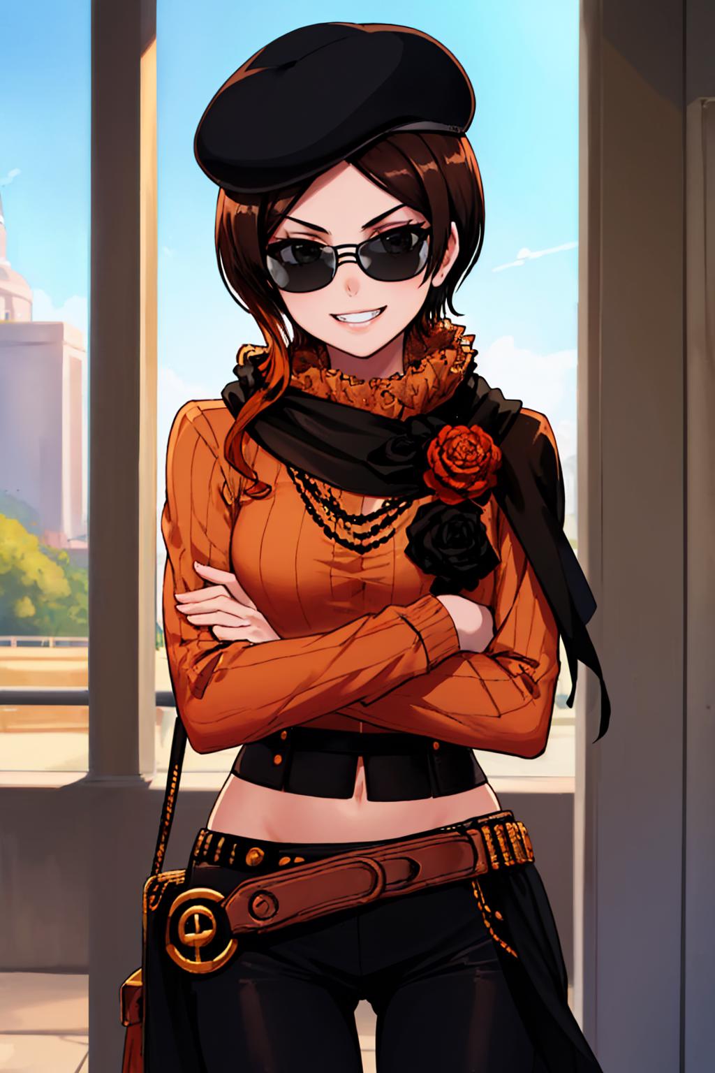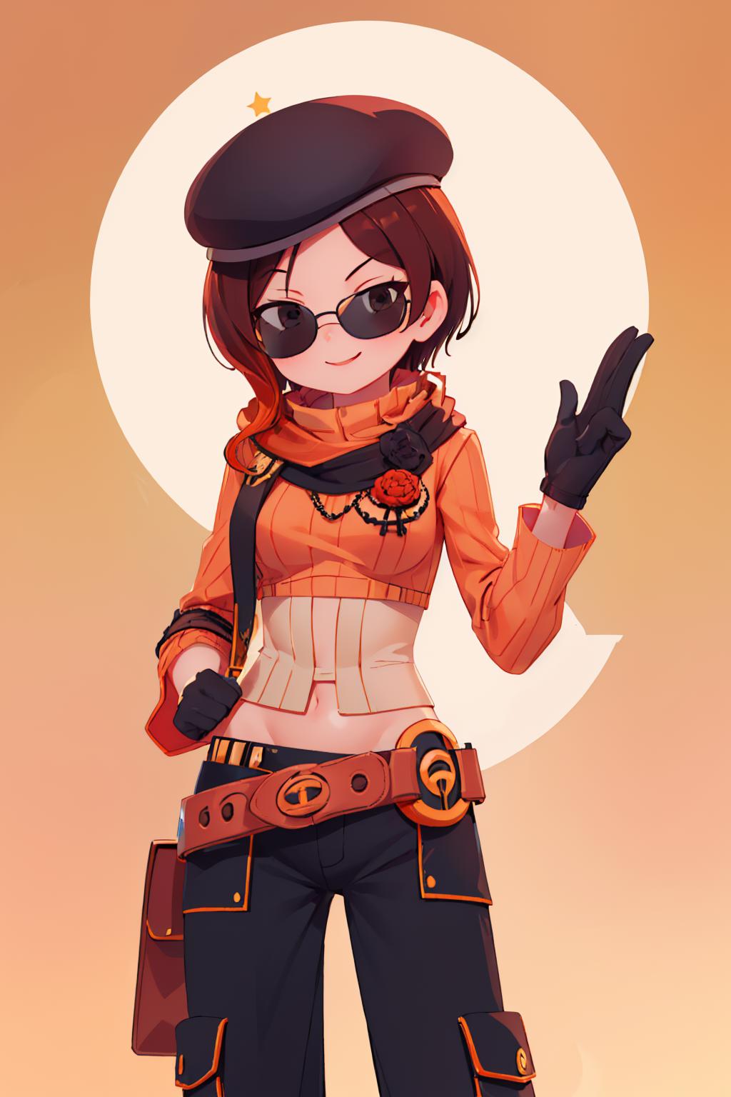 Default Outfit: beret, sunglasses, orange sweater, gloves, pants, jewelry, scarf, belt