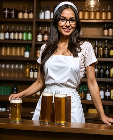 أسلوب مقهى مريح<ب ر>نادلة مهتمة وودودة ذات شعر طويل, شعر أسود مموج وبنظارات يبتسم بدفء. إنها ترتدي قبعة بيضاء, قميص أبيض, and a ب رown leather apron while working behind a wooden counter.