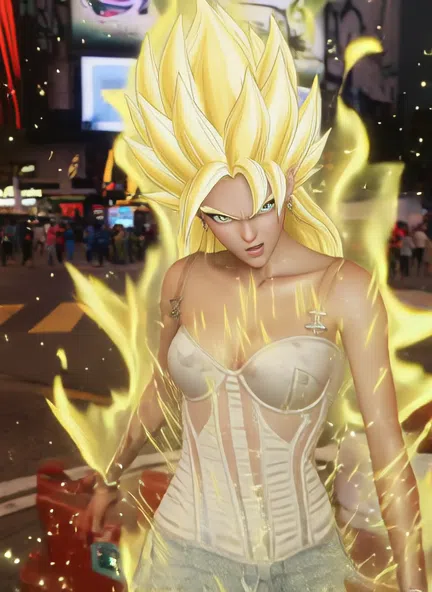 فوراً حوّل فيديوك إلى مشهد سوبر سايان ديناميكي مع شعر ذهبي متلألئ, هالة الطاقة, وأجواء المعركة الملحمية.