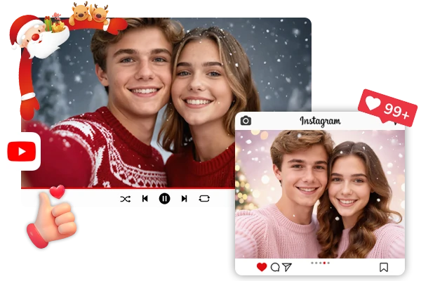 حوّل أي صورة إلى صورة عطلة احتفالية فورا. يضيف مولد صورة كريسماس الـAI تلقائيا قبعات سانتا وأزياء كريسماس لأي شخص في صورتك - الناس، الحيوانات الأليفة، أو شخصيات الرسوم المتحركة. ما عليك سوى رفع صورتك، ويكتشف الـAI الوجوه ويطبق عناصر عيد الميلاد المناسبة. أنشئ صور ملفات شخصية ممتعة، ومنشورات وسائل التواصل الاجتماعي، وبطاقات كريسماس دون التسوق لشراء الأزياء.