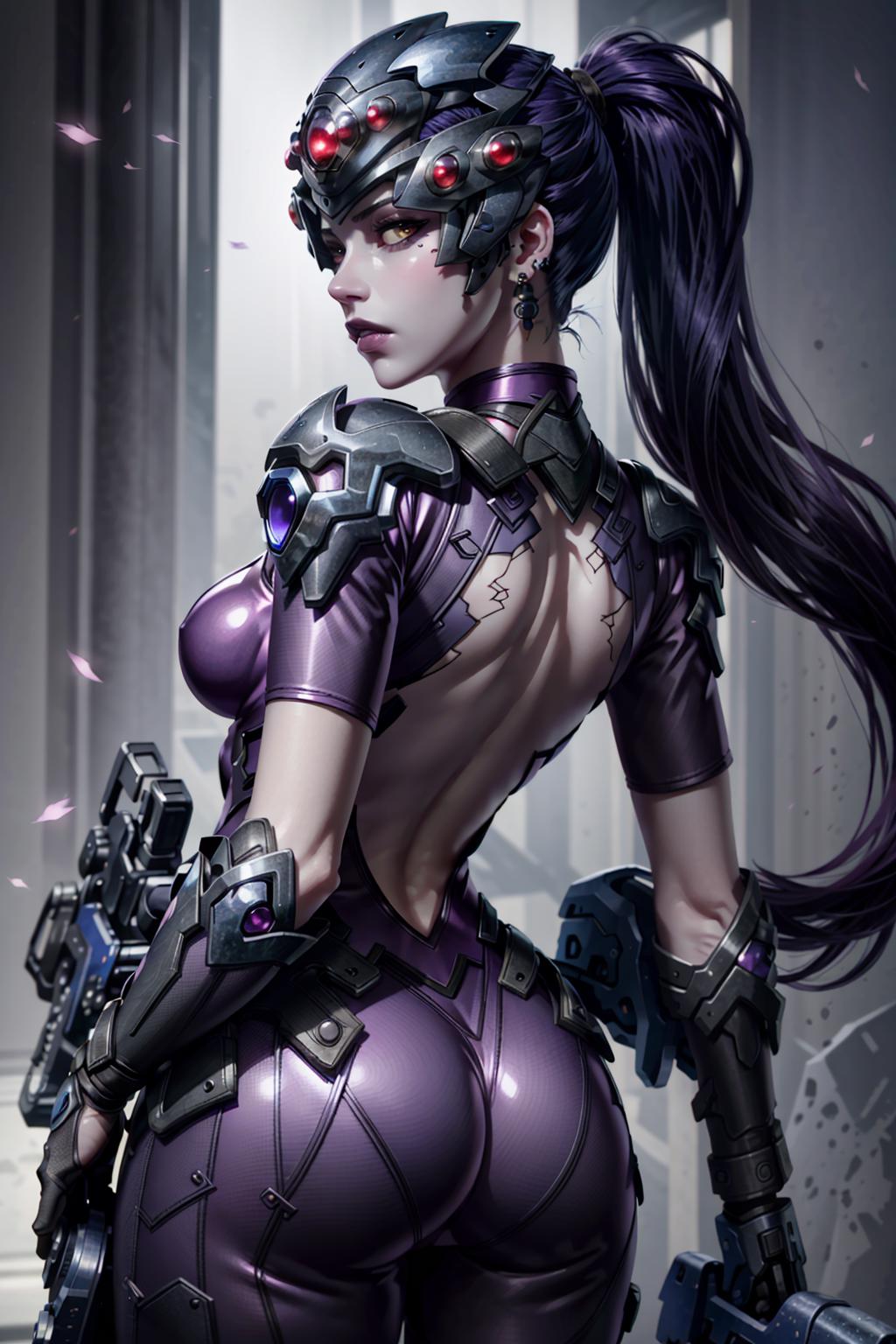 WidowOver, 1girl, widowmaker (overwatch), solo, head-mounted display, yellow eyes, long hair, colored skin, purple skin, ponytail, purple lips, jewelry, earrings, ?, hair pulled back, lips, ?, purple hair, upper body, stud earrings, makeup, looking at viewer, nose, lipstick, pink ?, pauldrons, shoulder armor, medium ?, closed mouth